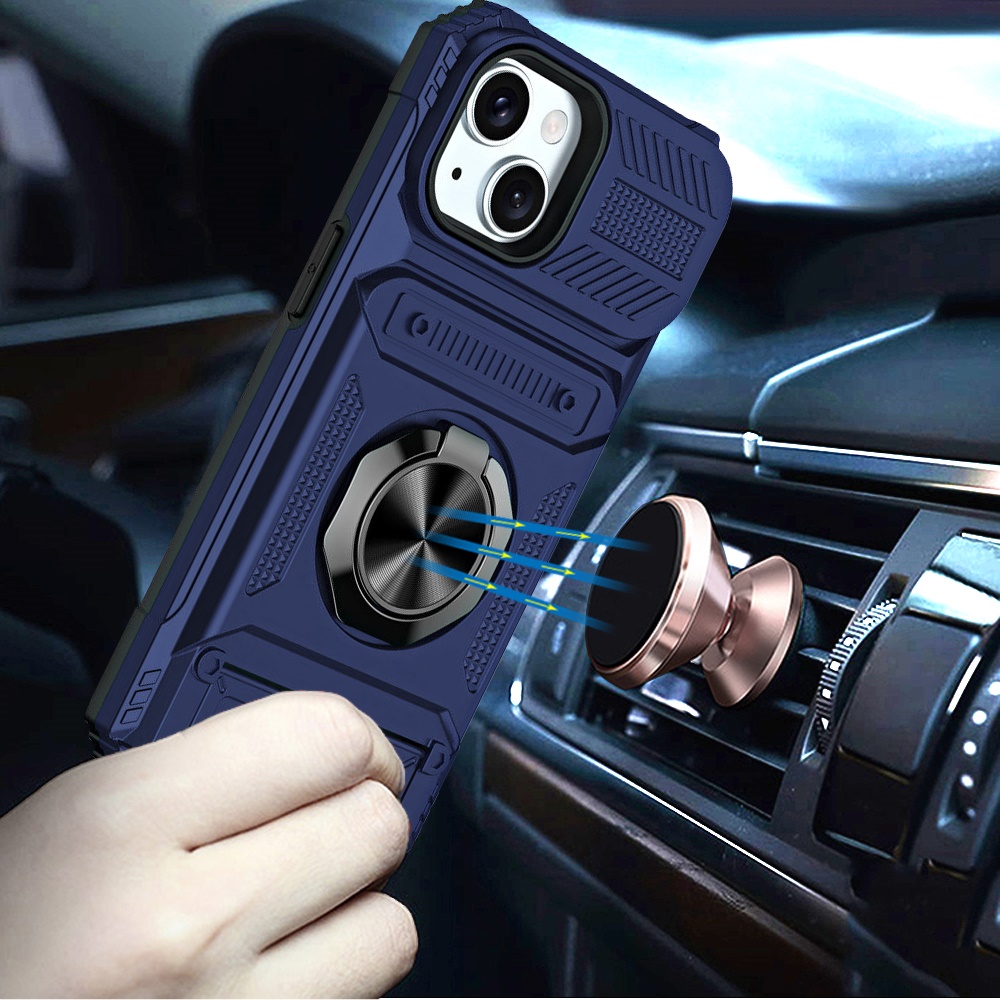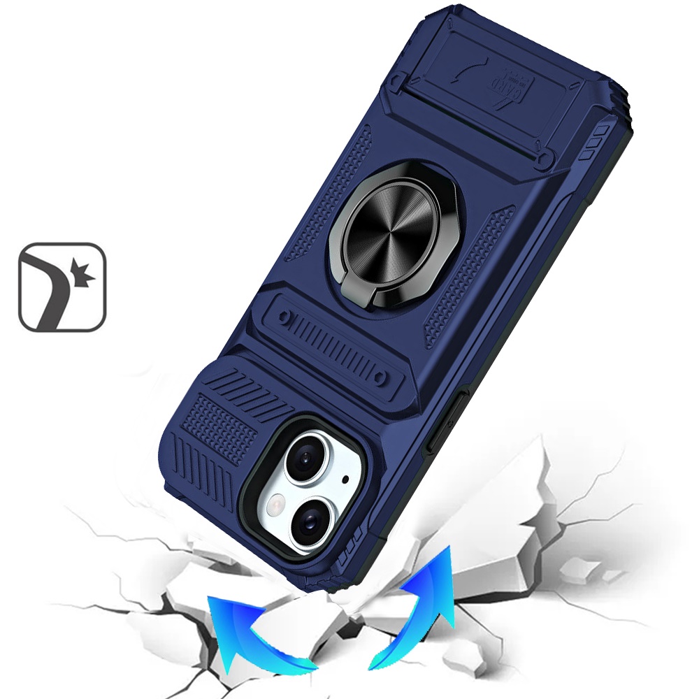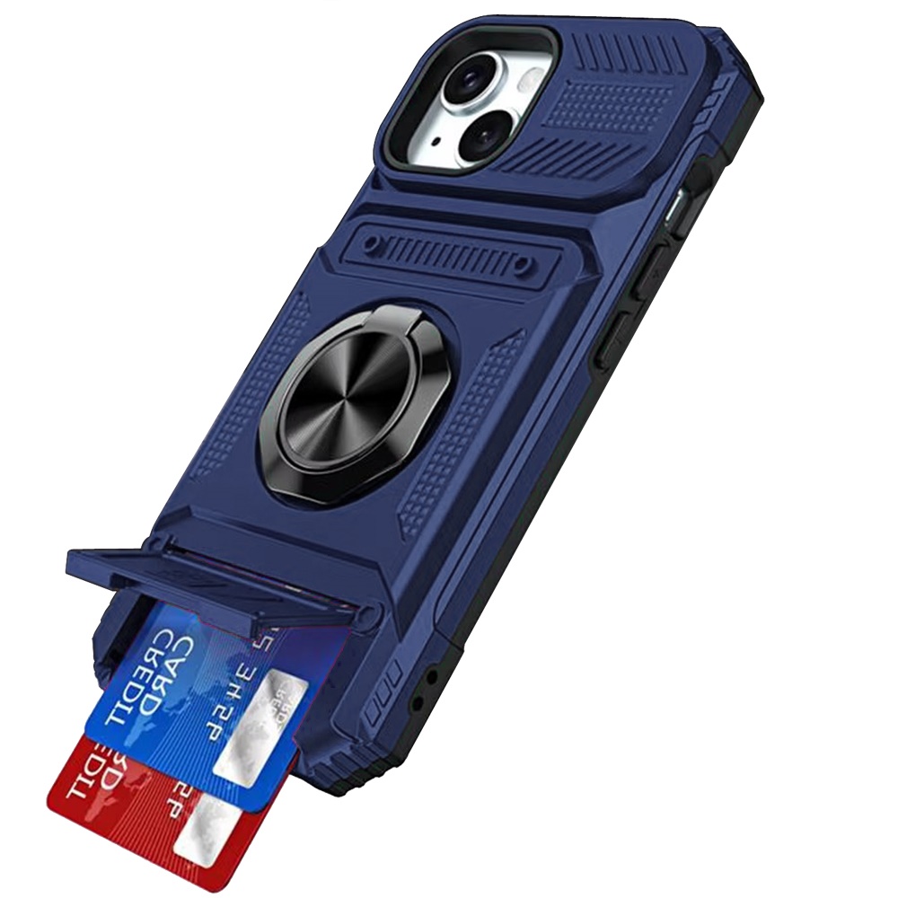 For iPhone 15 Multi-Functional 2X Card Slot Shockproof Metal Ring Hybrid Case - Blue