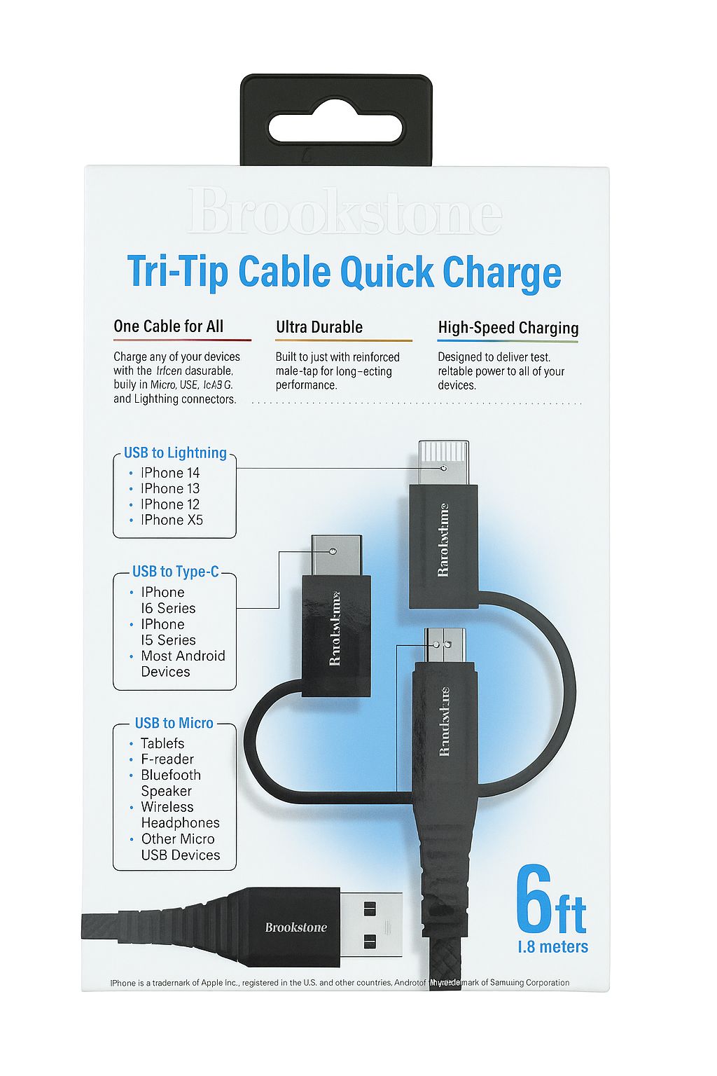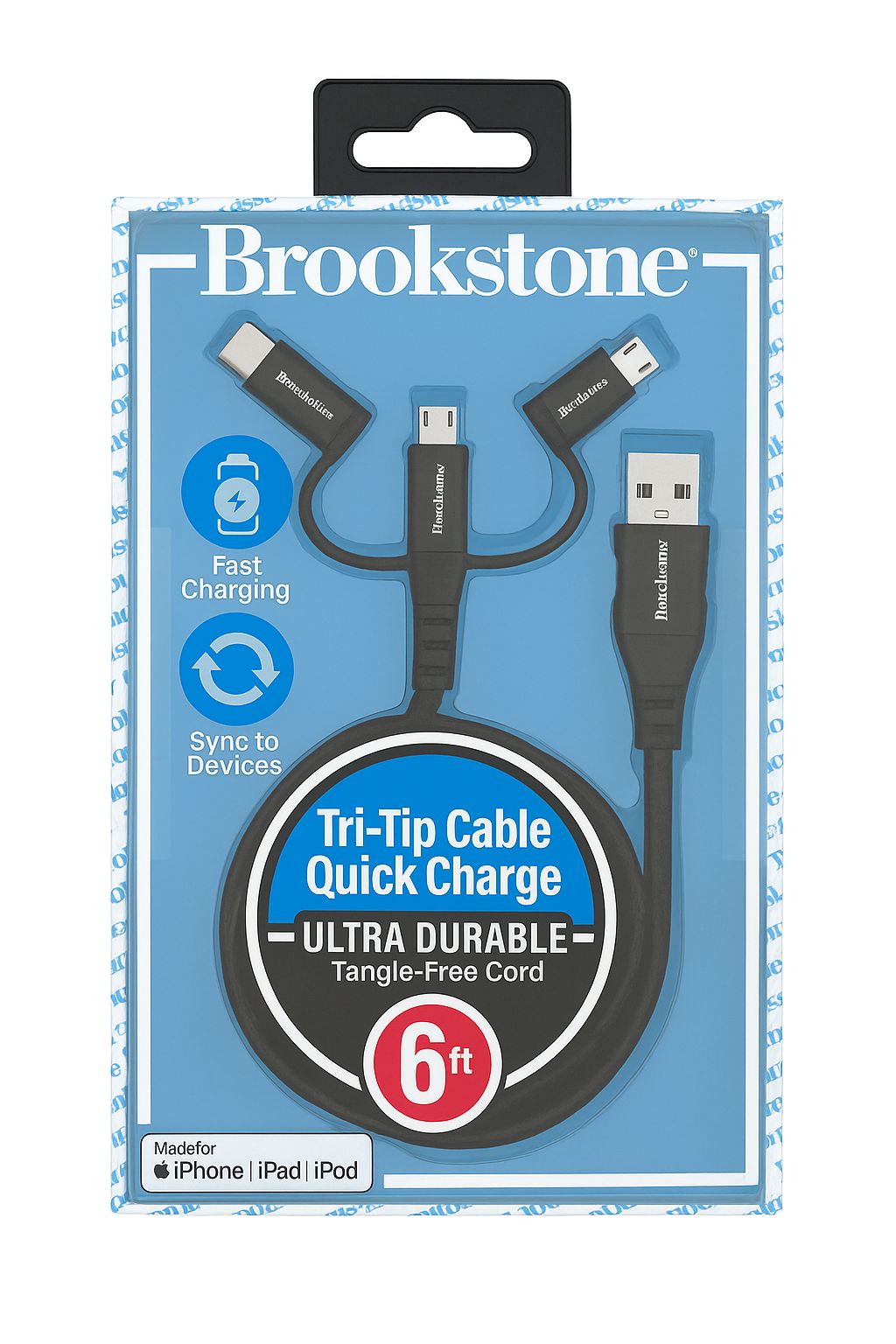 BROOKSTONE ONE CABLE FOR ALL - TRIP TIP CABLE QUICK - ULTRA DURABLE TANGLE FREE - 6 FEET CORD - USB TO LIGHTNING/TYPE-C/MICRO - BLACK (D8 BROOKSTONE#39)