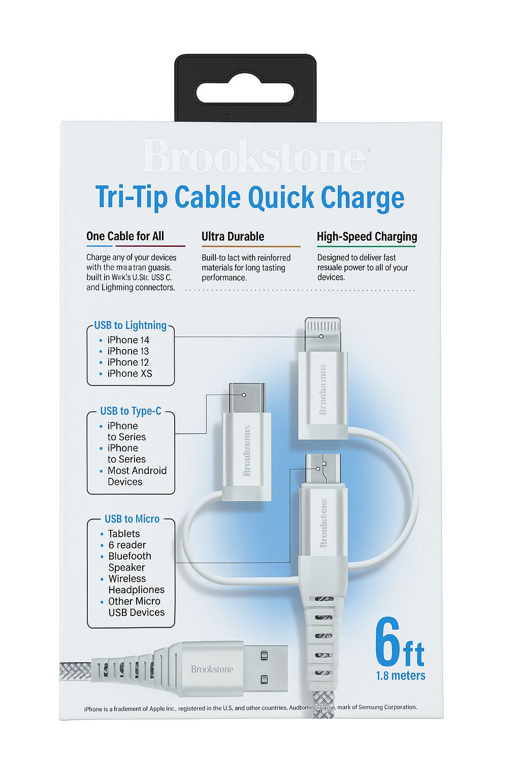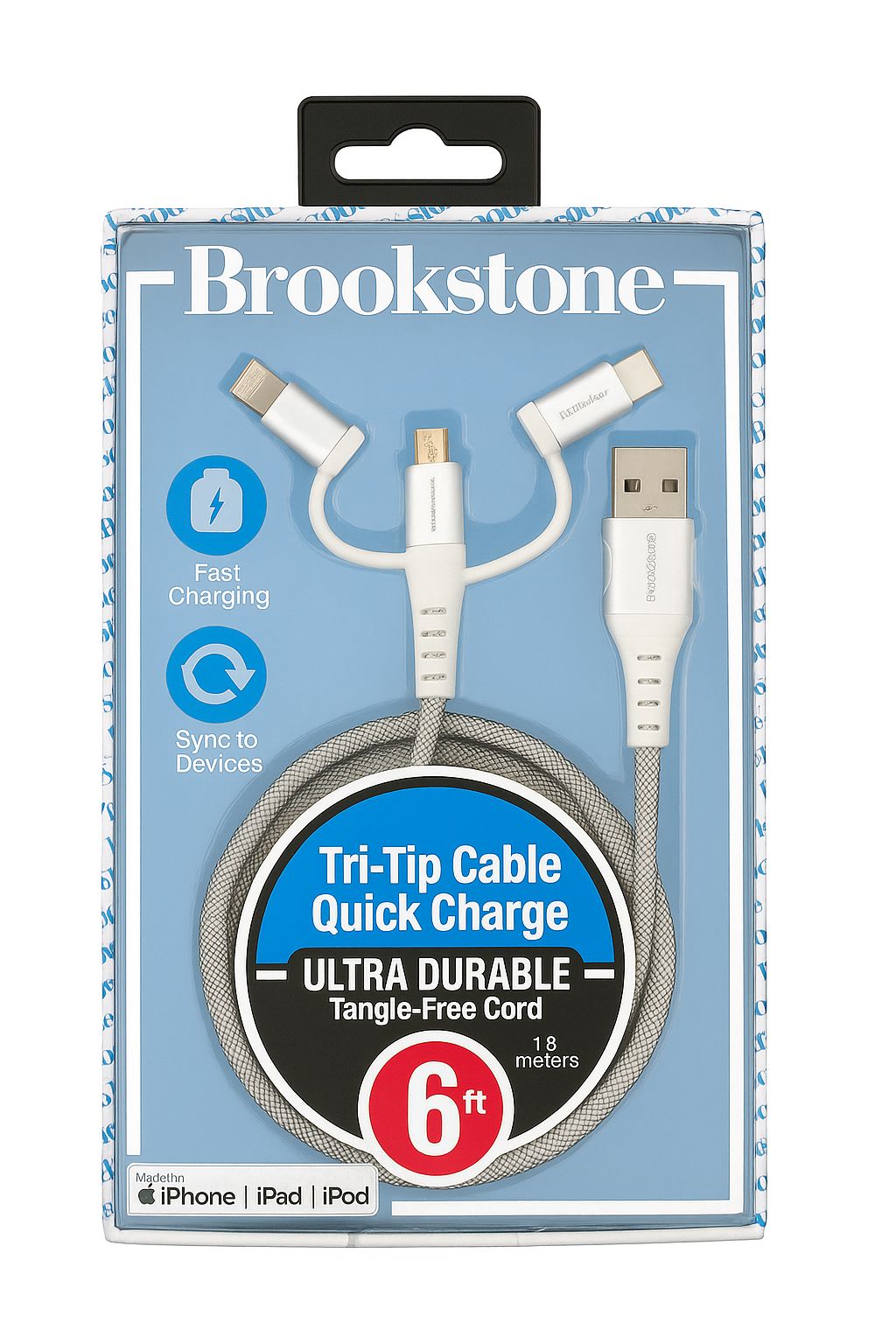 BROOKSTONE ONE CABLE FOR ALL - TRIP TIP CABLE QUICK - ULTRA DURABLE TANGLE FREE - 6 FEET CORD - USB TO LIGHTNING/TYPE-C/MICRO - WHITE (D8 BROOKSTONE#38)