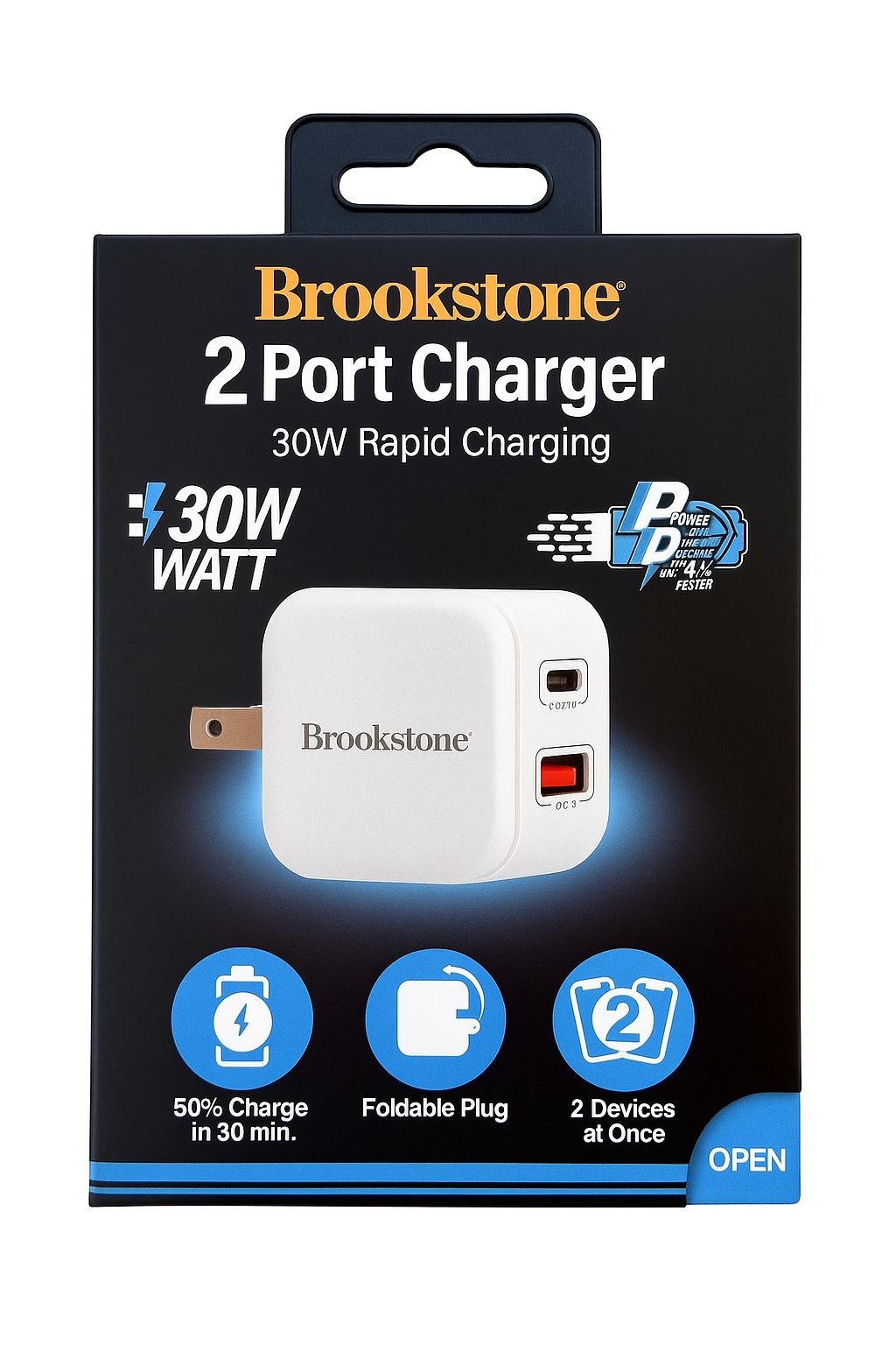 BROOKSTONE 2 PORT CHARGER - 30W RAPID CHARGING - 50% CHARGE IN 30 MIN - FOLDABLE PLUG - 2 DEVICES AT TIME - BK11-2P30F-WT - WHITE (LANE D11 BROOKSTONE#14)