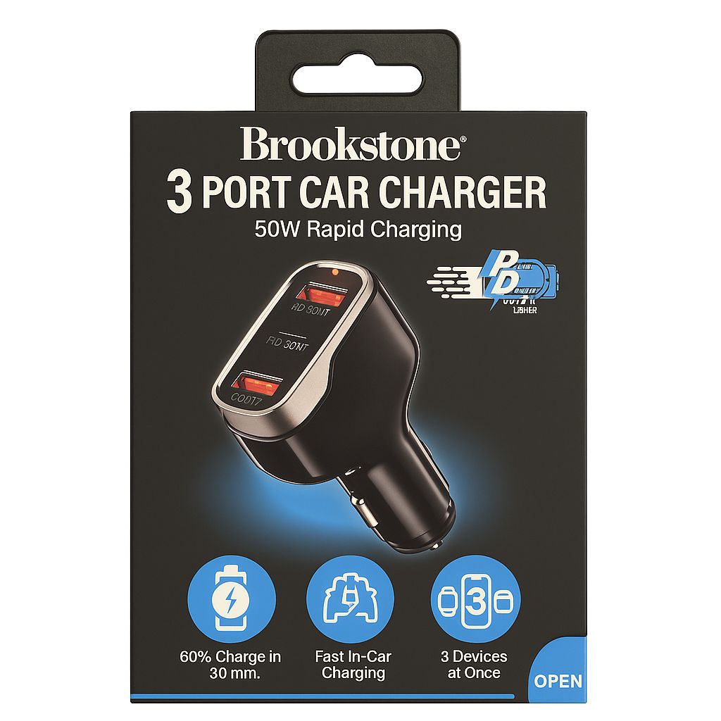 BROOKSTONE 3 PORT 50 WATT CAR CHARGER - 3 DEVICES AT A TIME - 1 30W PD AND 2 USB QC2.4AMP - BK12-3P50-BKS - BLACKSILVER (D9 BROOKSTONE#25)