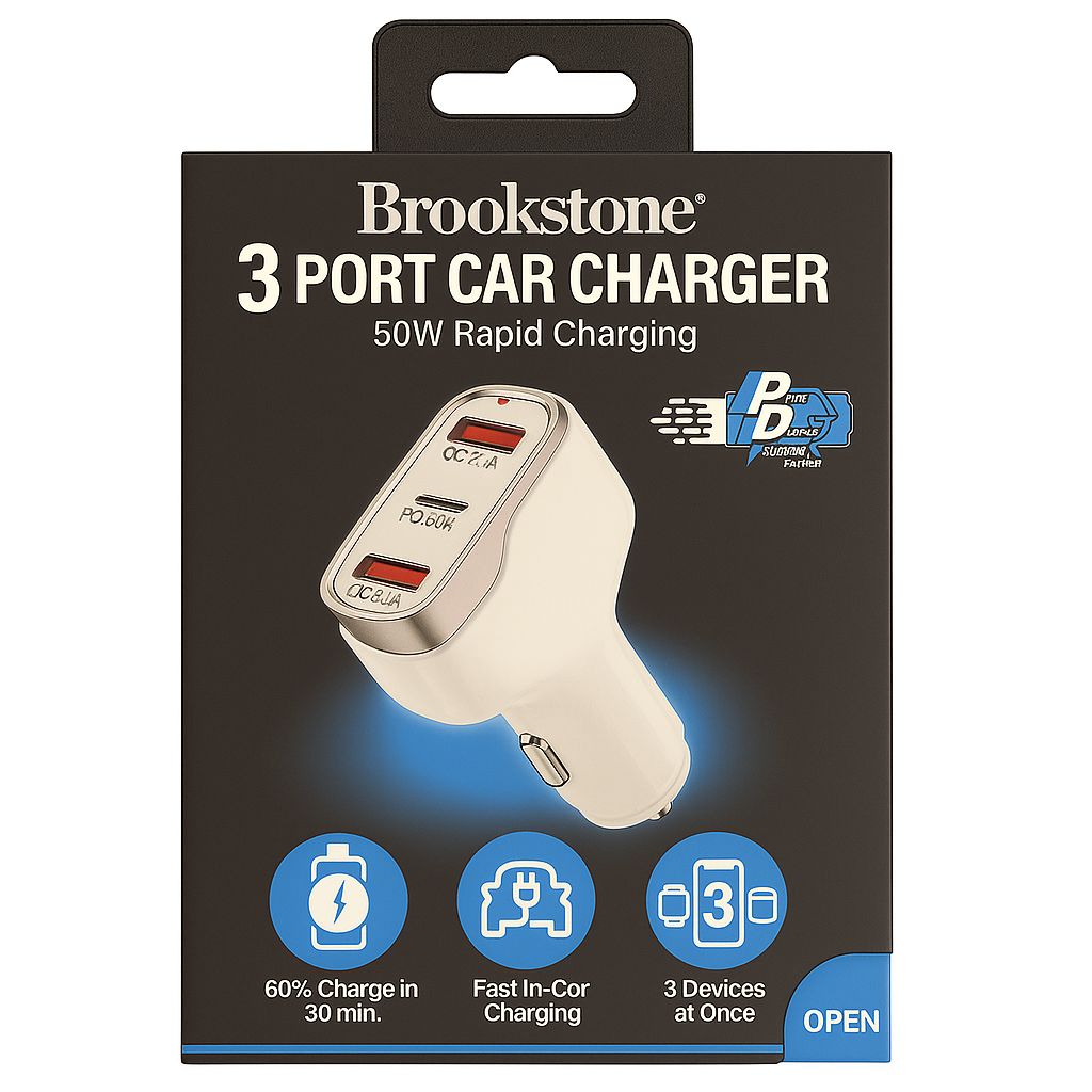 BROOKSTONE 3 PORT 50 WATT CAR CHARGER - 3 DEVICES AT A TIME - 1 30W PD AND 2 USB QC2.4AMP - BK12-3P50-WTS - WHITEKSILVER (D9 BROOKSTONE#26)