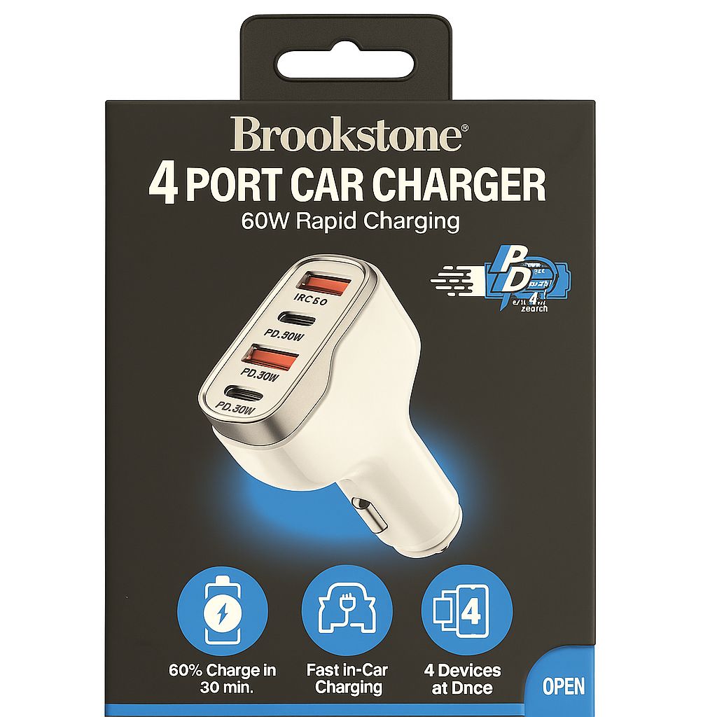 BROOKSTONE 60W 4 PORT CAR CHARGER - RAPID CHARGING - 2 30W C OUTPUT AND 2 QC3.0 OUTPUT - BK12-4P60-WTS - WHITESILVER (D9 BROOKSTONE#27)