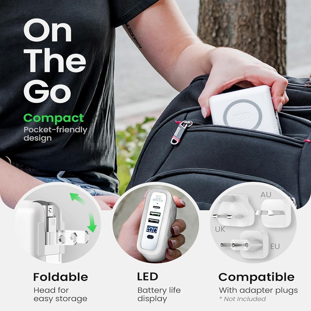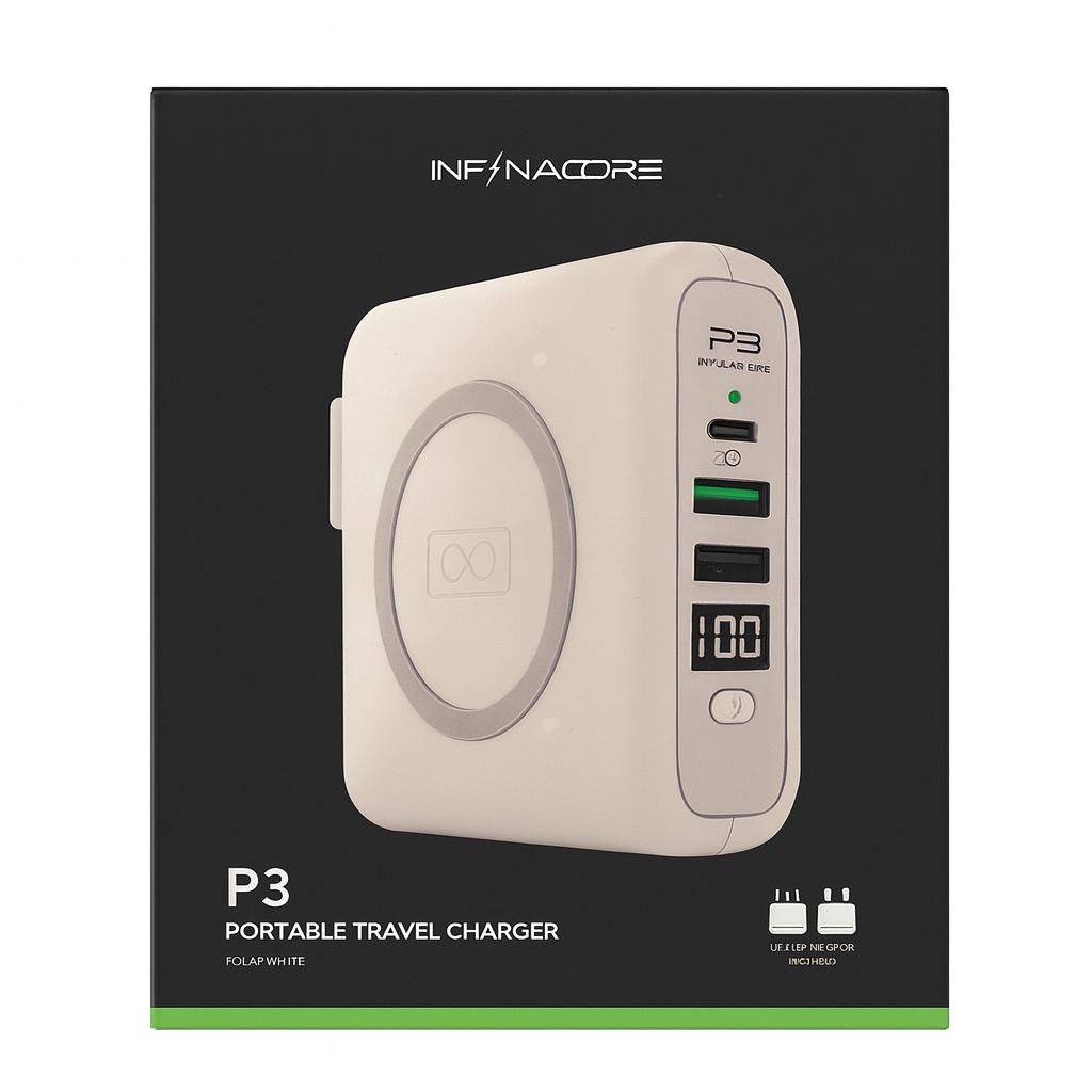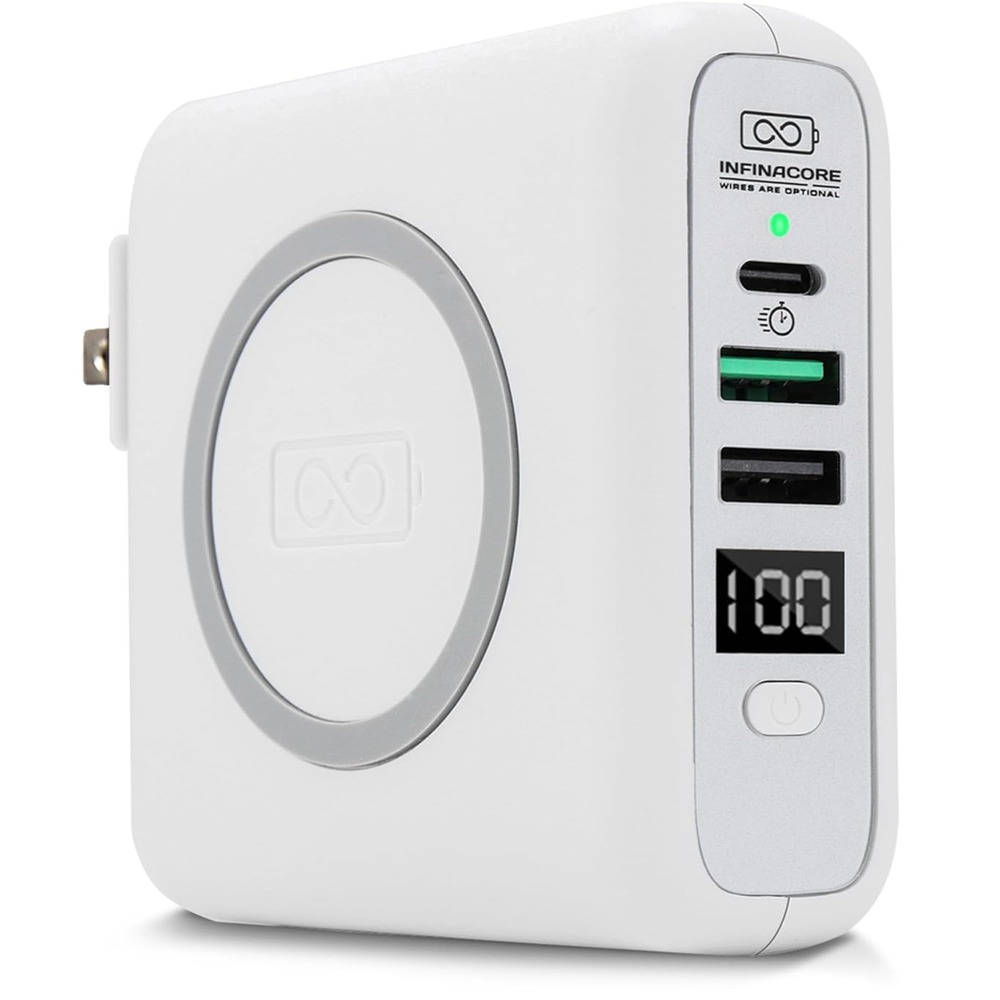INFINACORE Pandora Portable Power (P3) Global with UK/EU ADAPTER - 8000mAh Fast Charging Qi Wireless Power Bank Charger - Wireless Charger with 3 Ports USB-C Wall Charger - Compatible with iPhoneD Laptop iPad Tablet Power Bank with LED Display - White (A5 INFINACORE#3)