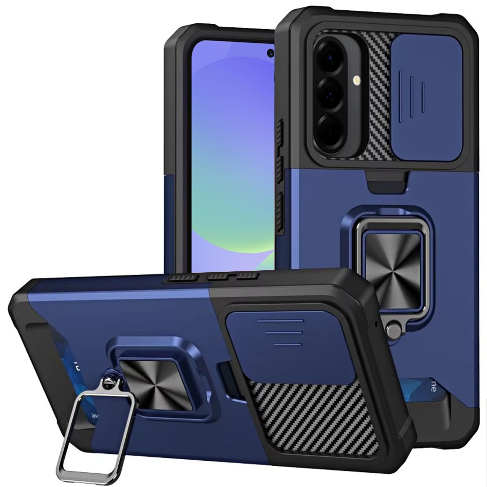 For Samsung Galaxy A37 Multi-Functional Card Magnetic Ring Stand Hybrid Camera Case Cover - Blue