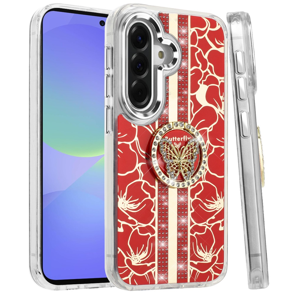 For Samsung Galaxy A37 Splendid Floral Designs with Metal Camera and Buttons with Butterfly Ring Stand Hybrid Case - Red