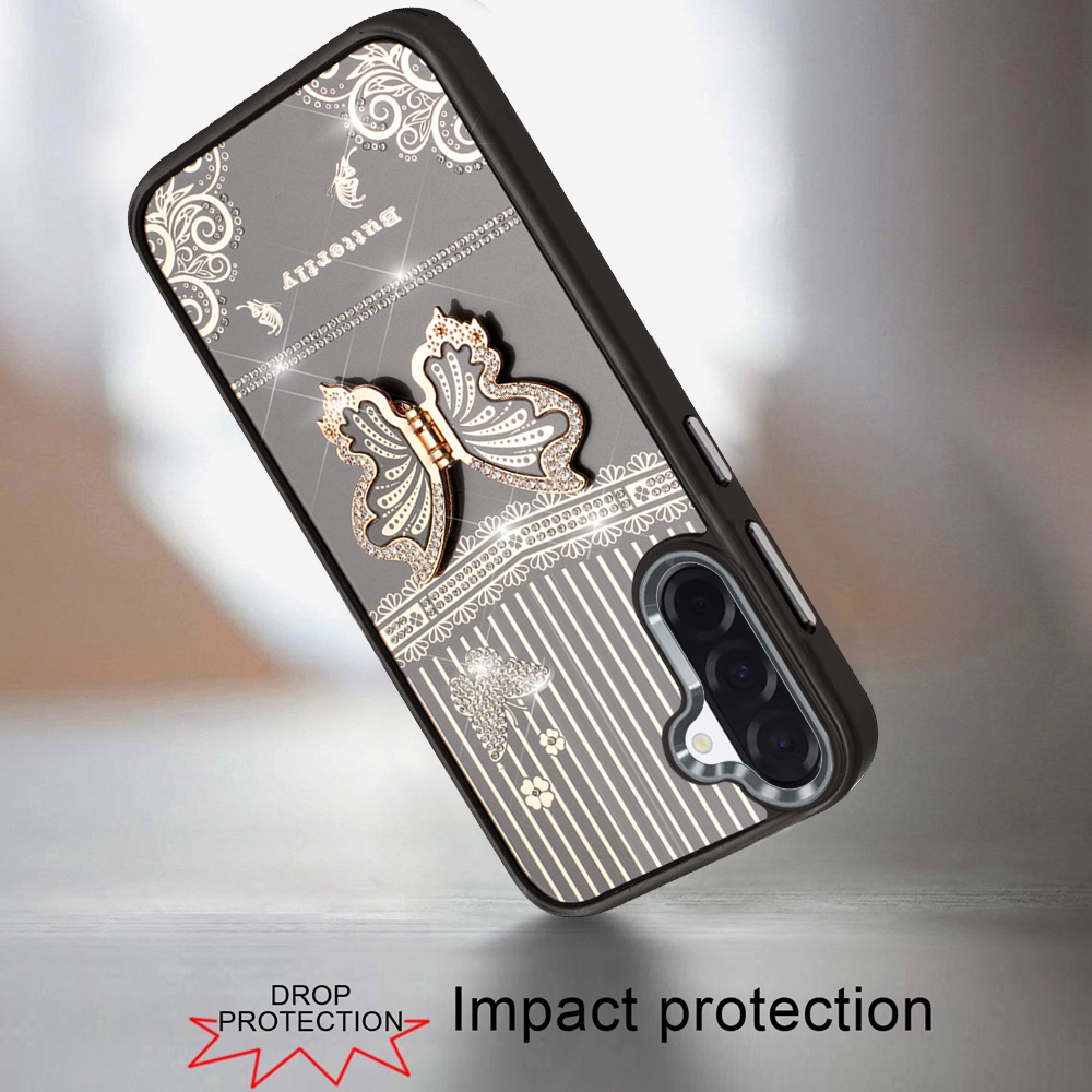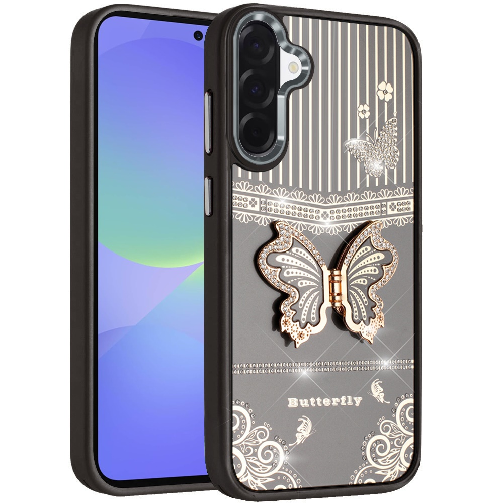 For Samsung Galaxy A37 Splendid Glitter Butterfly Design Stand with Metallic Edges Hybrid Case - Black