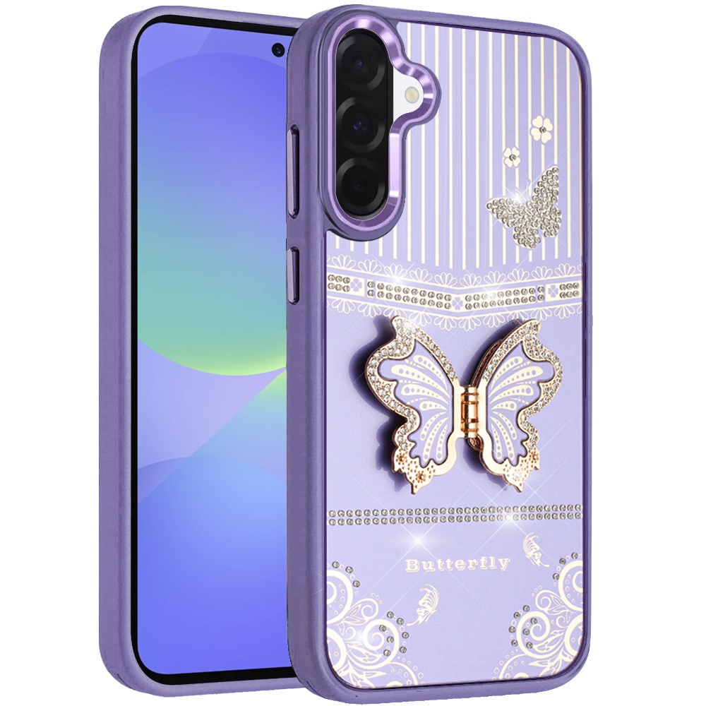 For Samsung Galaxy A37 Splendid Glitter Butterfly Design Stand with Metallic Edges Hybrid Case - Dark Purple