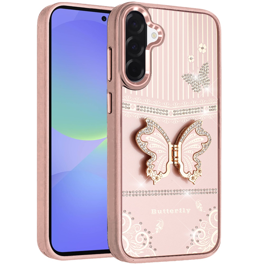 For Samsung Galaxy A37 Splendid Glitter Butterfly Design Stand with Metallic Edges Hybrid Case - Rose Gold