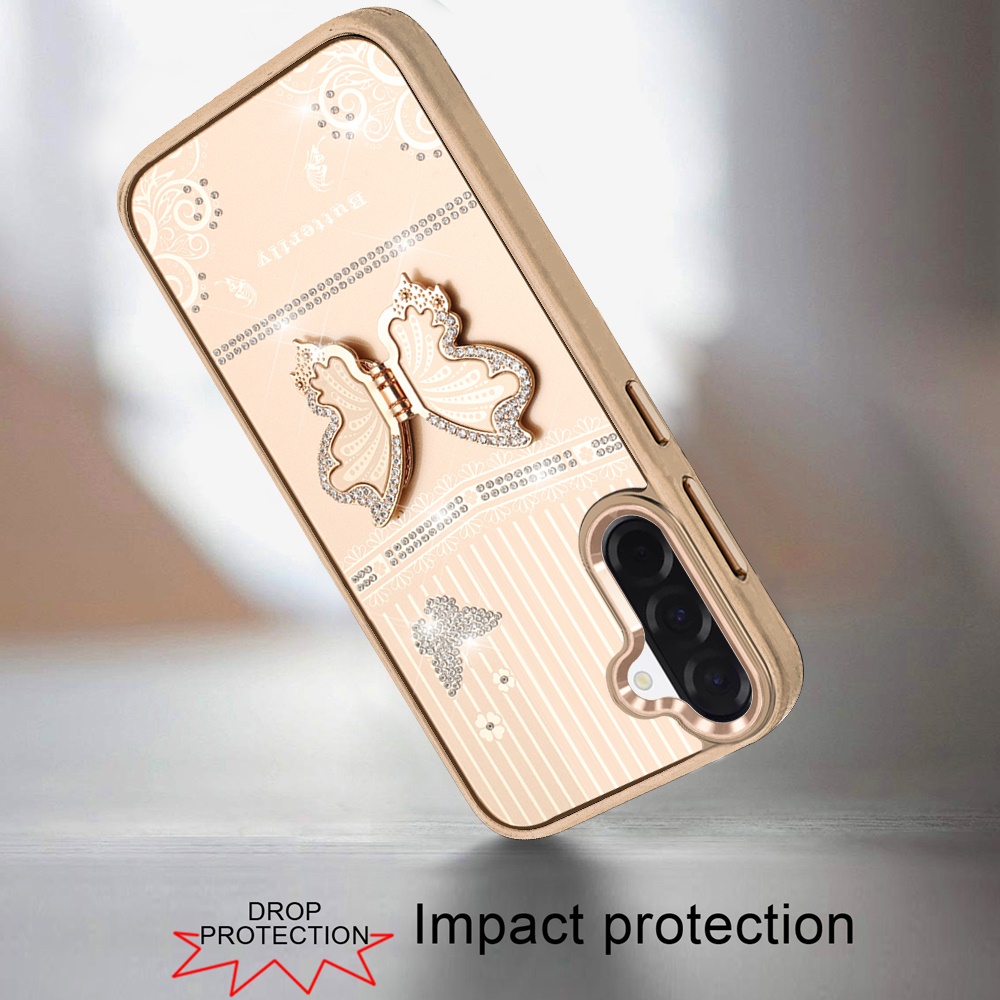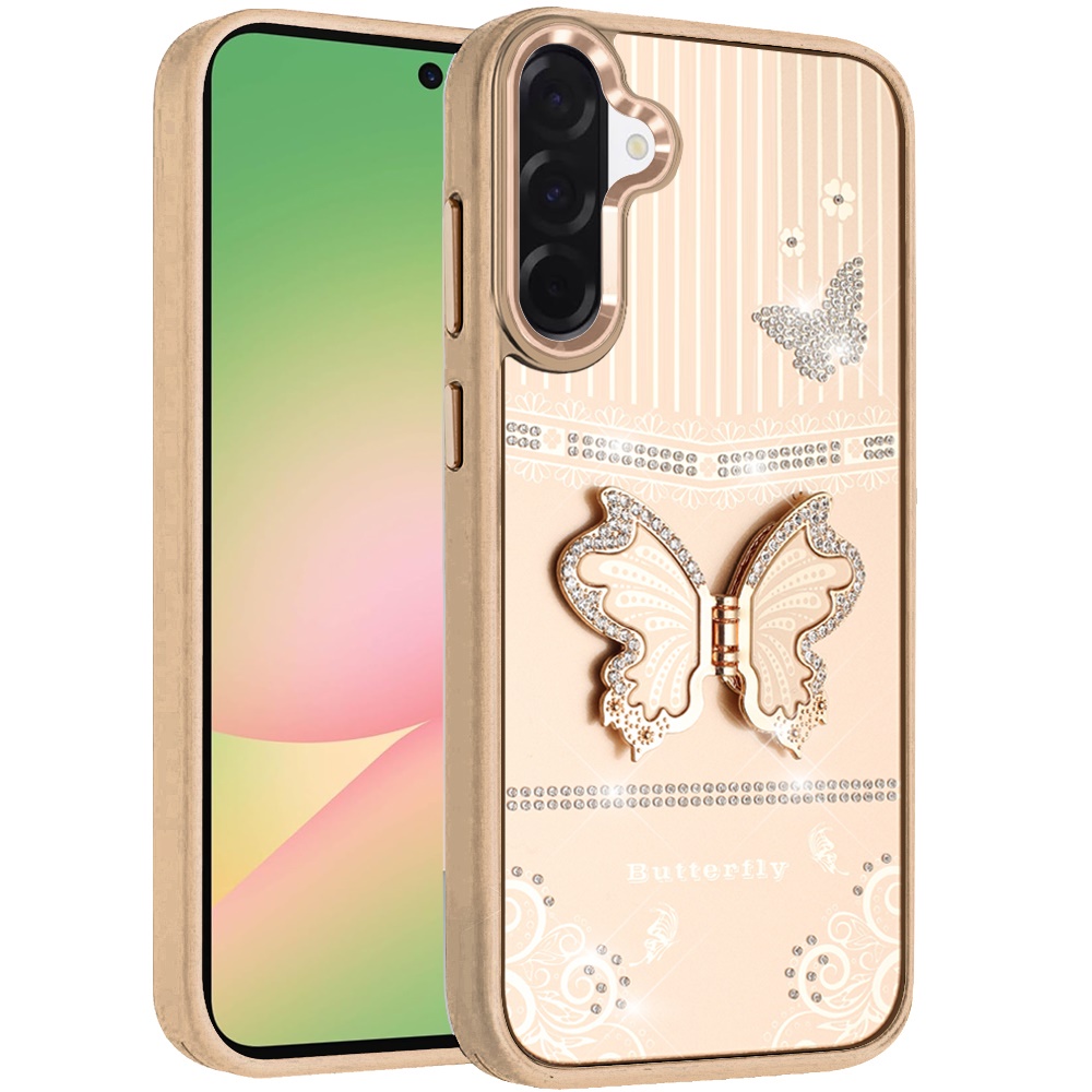 For Samsung Galaxy A57 Splendid Glitter Butterfly Design Stand with Metallic Edges Hybrid Case - Gold
