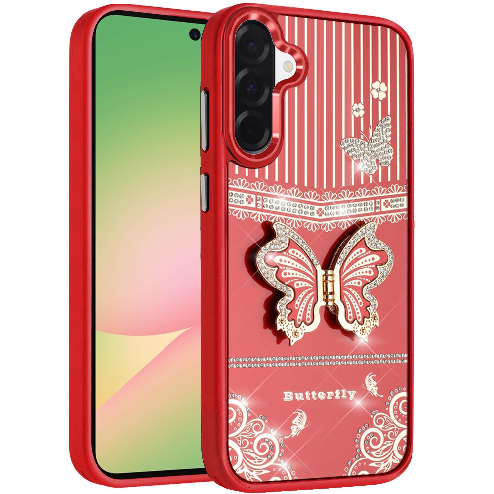 For Samsung Galaxy A57 Splendid Glitter Butterfly Design Stand with Metallic Edges Hybrid Case - Red