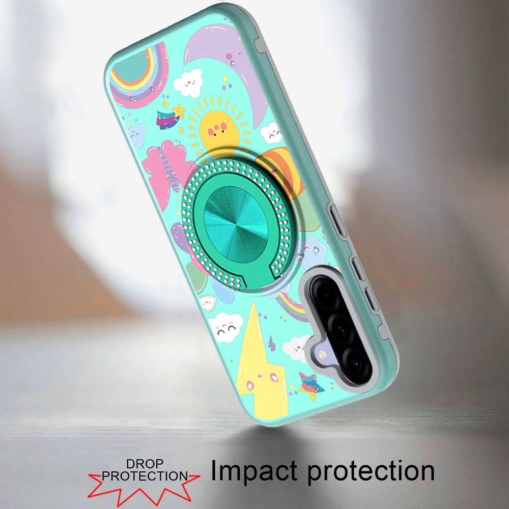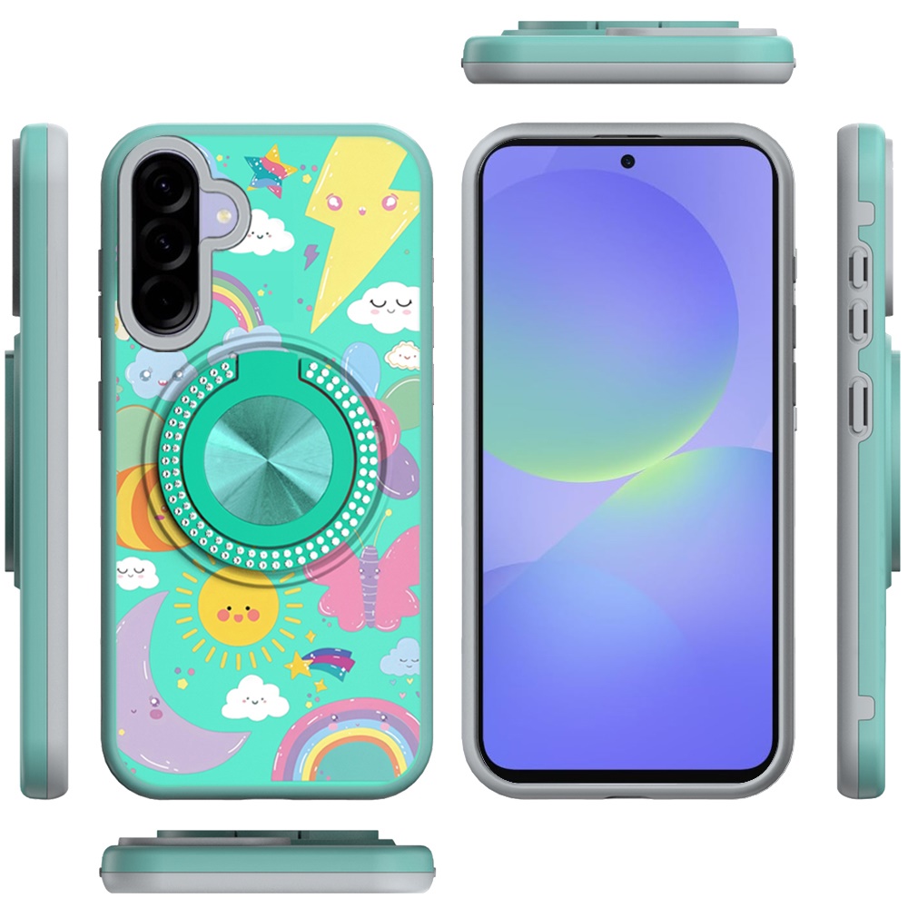 For Samsung Galaxy A37 Metal Diamond CD Pattern Design Matte Finished Hybrid with Rotational Ring [Car Mount Friendly] Case - Aqua with Celestial Sun Rainbows