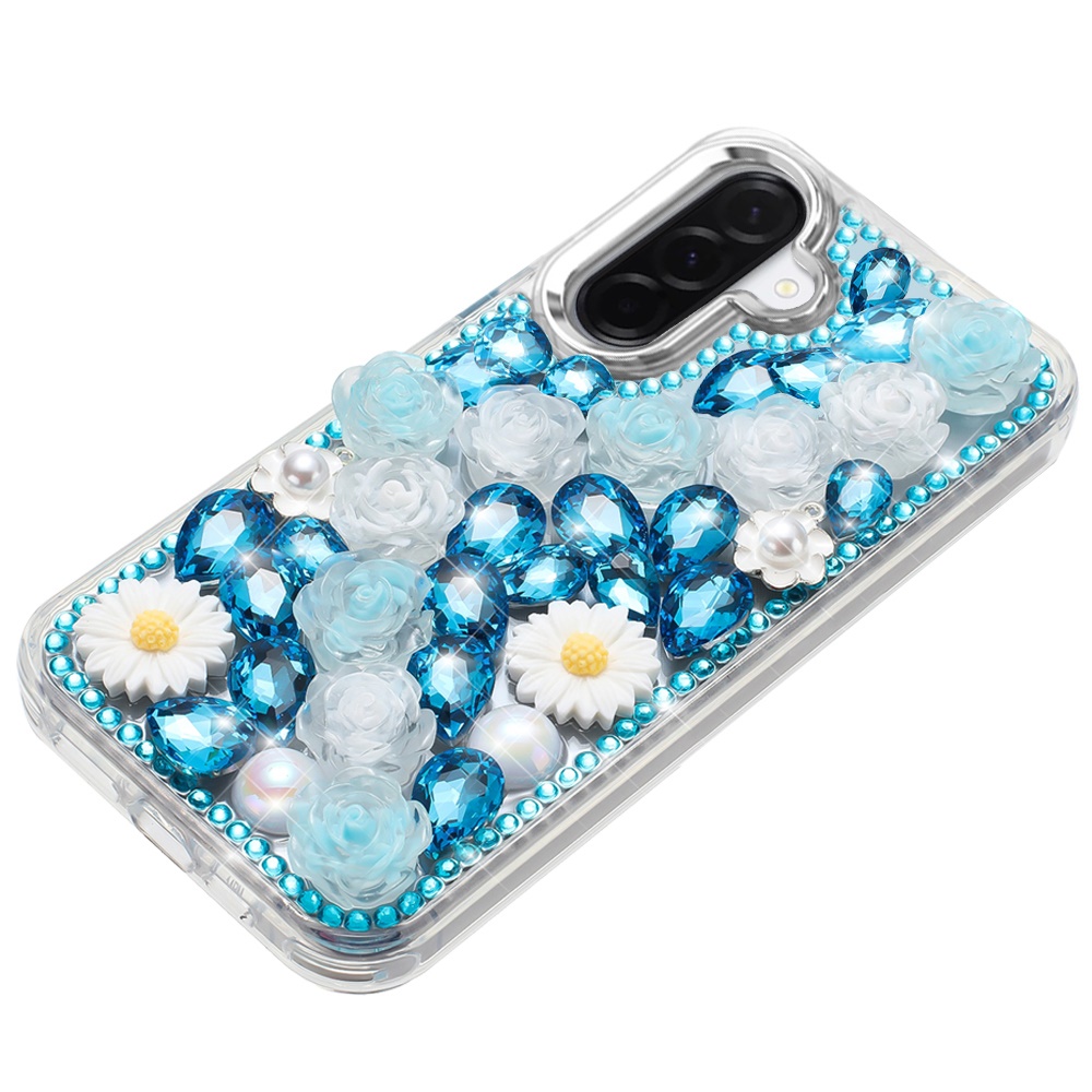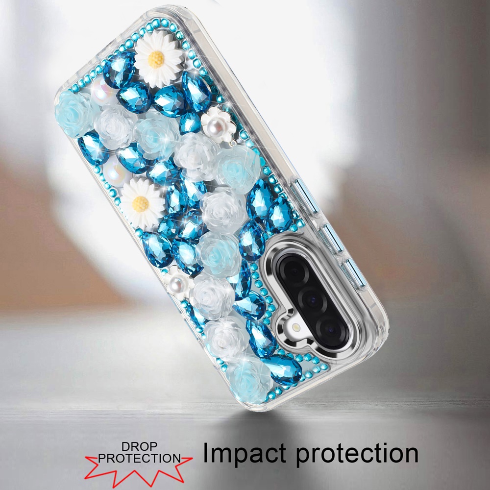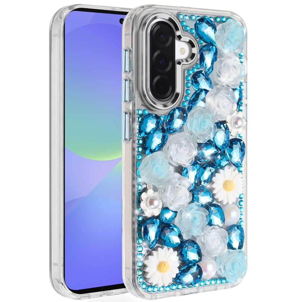 For Samsung Galaxy A37 Spectacular Full Bling Stones Glitter HQ Hybrid Floral Series - Blue
