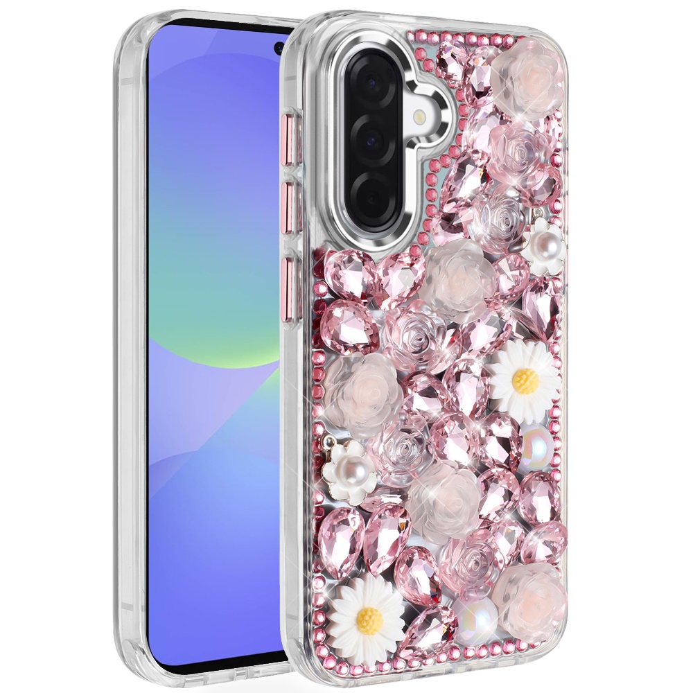 For Samsung Galaxy A37 Spectacular Full Bling Stones Glitter HQ Hybrid Floral Series - Pink