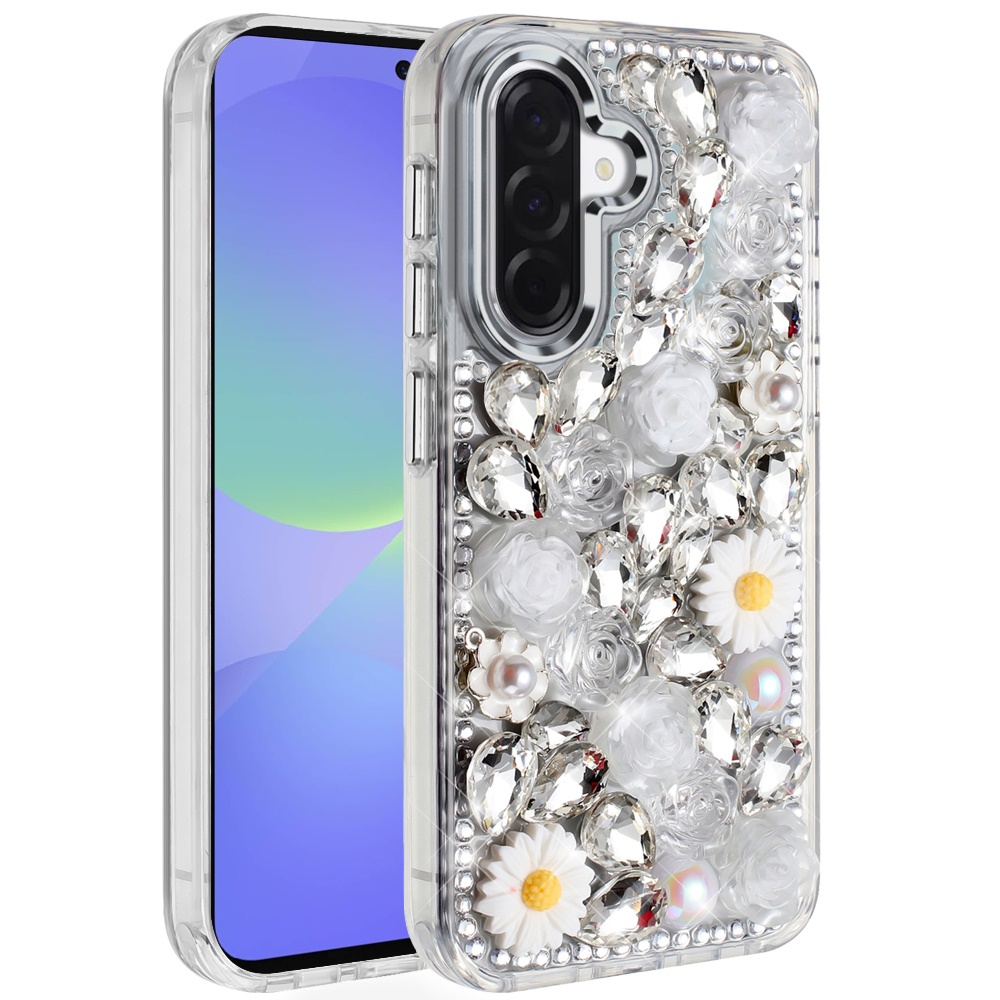 For Samsung Galaxy A37 Spectacular Full Bling Stones Glitter HQ Hybrid Floral Series - White