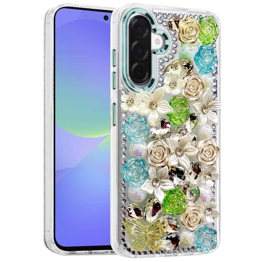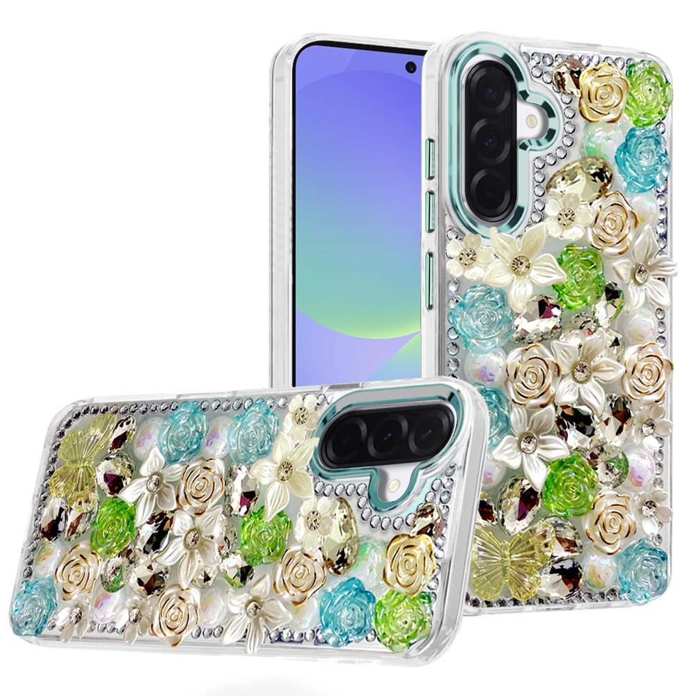 For Samsung Galaxy A37 Muti-Color Rose Bling Stones Ornaments Case - Green