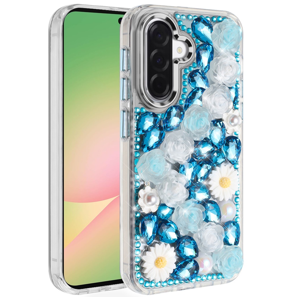 For Samsung Galaxy A57 Spectacular Full Bling Stones Glitter HQ Hybrid Floral Series - Blue