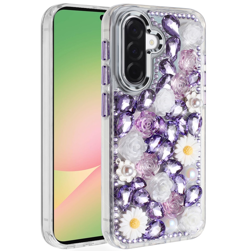 For Samsung Galaxy A57 Spectacular Full Bling Stones Glitter HQ Hybrid Floral Series - Purple
