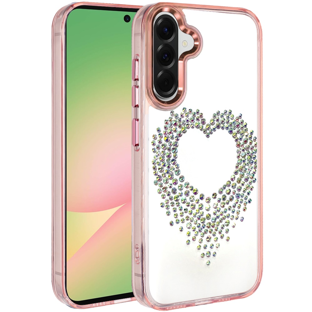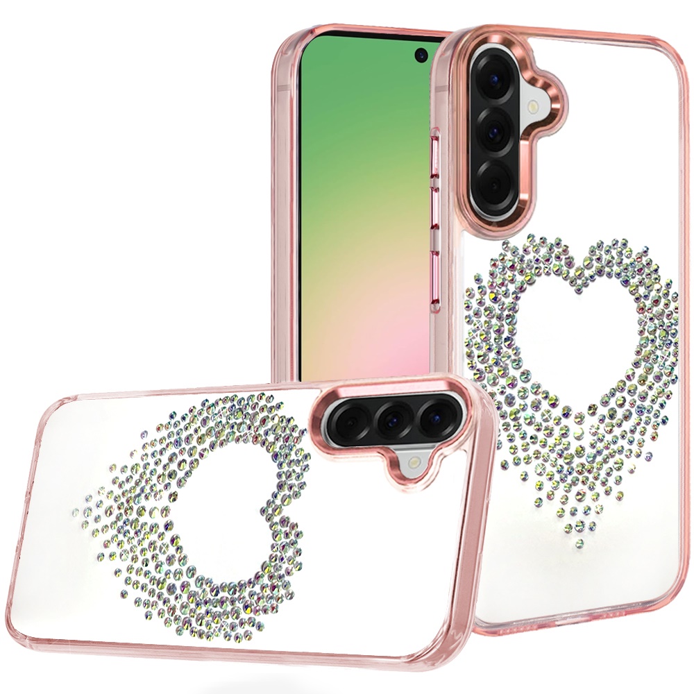 For Samsung Galaxy A57 Angel Hearts Bling Shimmer Colorful Glitter Chrome Edged Hybrid Case - Rose Gold