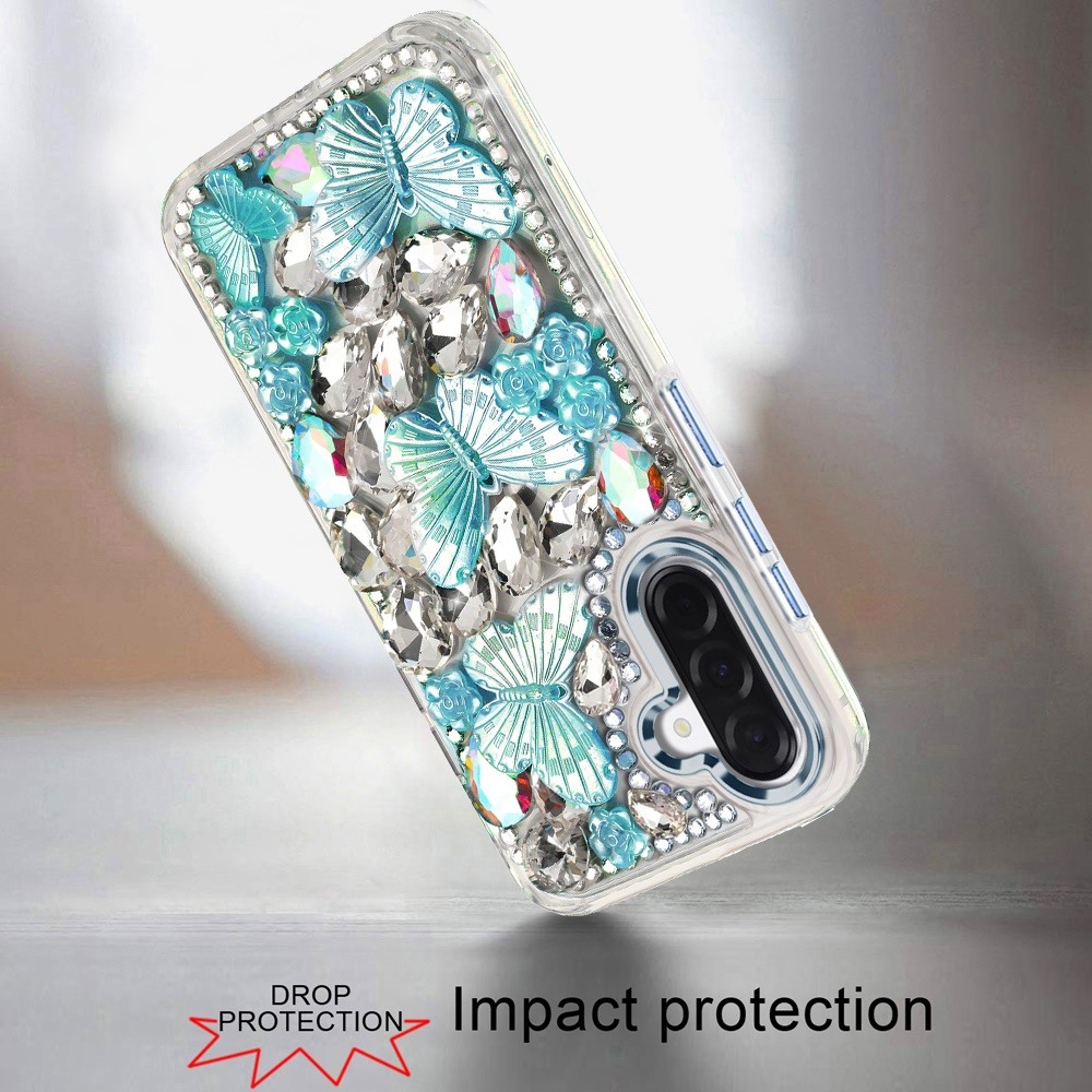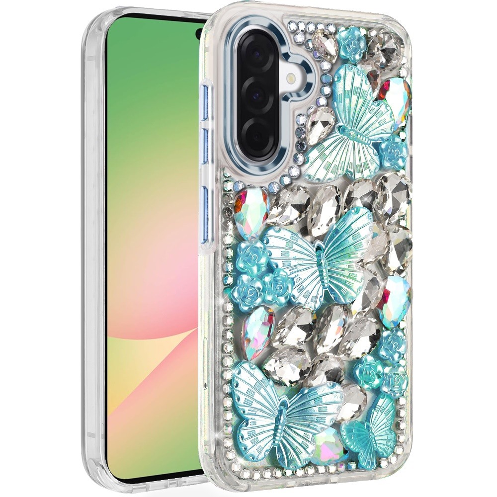 For Samsung Galaxy A57 Lavished Floral Butterfly Bling Stones Hybrid Case - Blue