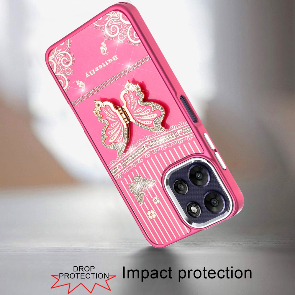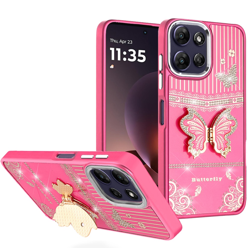 For Motorola Moto G Power 5G 2025 Splendid Glitter Butterfly Design Stand with Metallic Edges Hybrid Case - Hot Pink