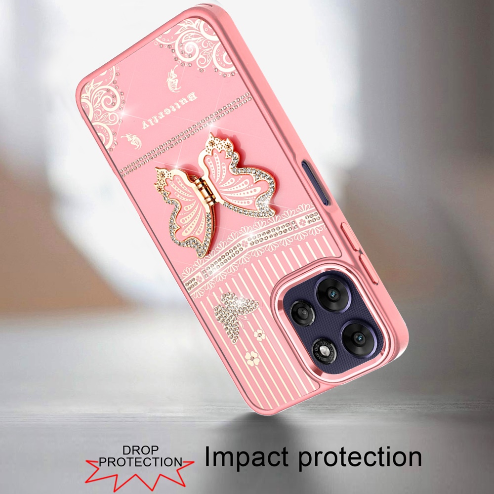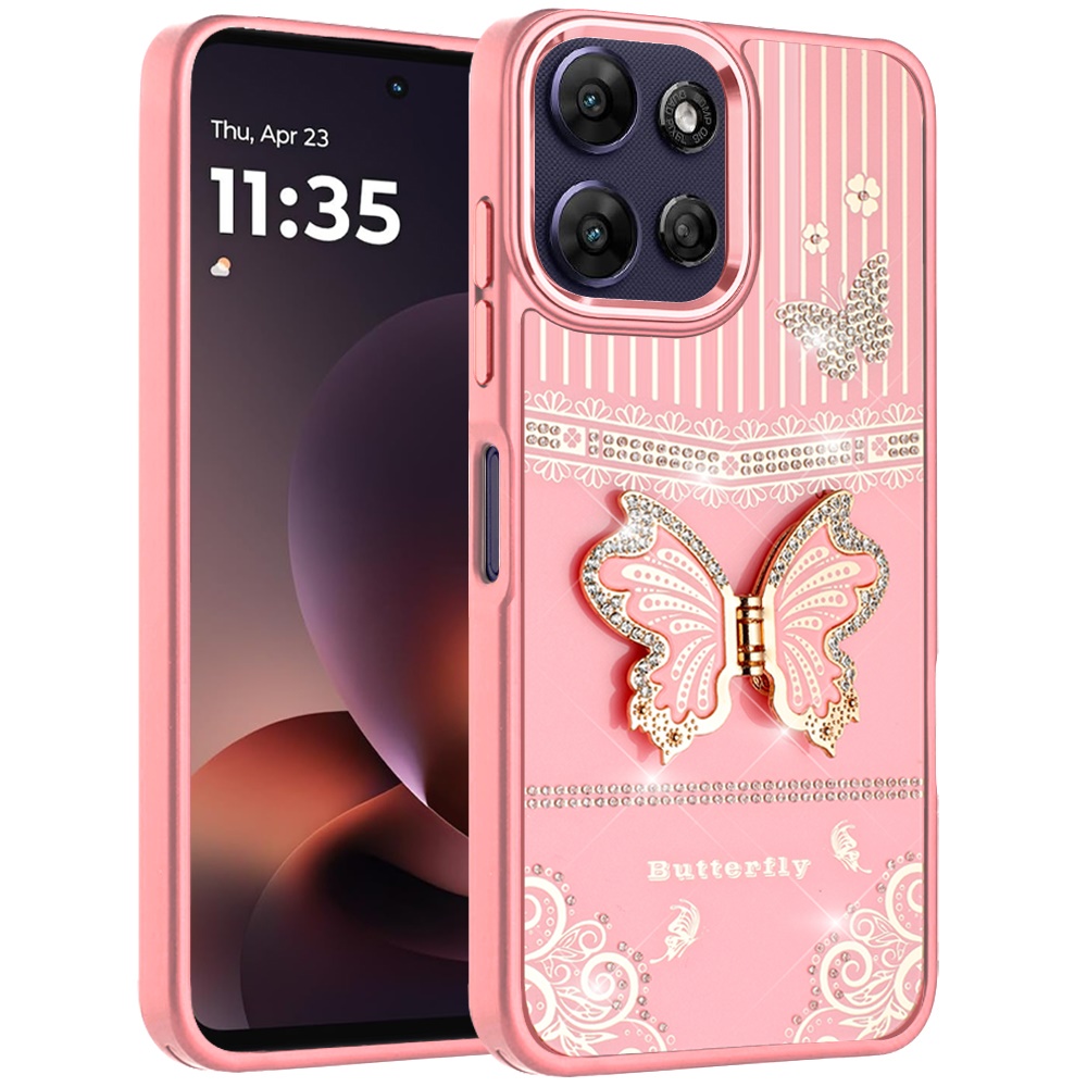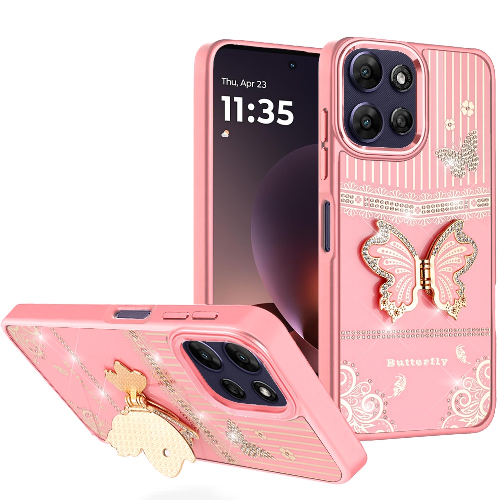 For Motorola Moto G Power 5G 2025 Splendid Glitter Butterfly Design Stand with Metallic Edges Hybrid Case - Light Pink
