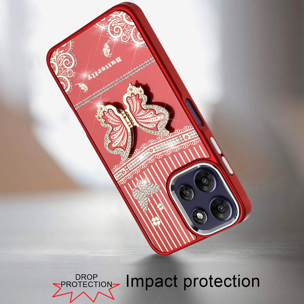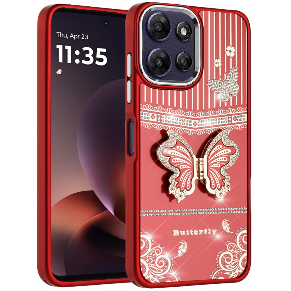 For Motorola Moto G Power 5G 2025 Splendid Glitter Butterfly Design Stand with Metallic Edges Hybrid Case - Red