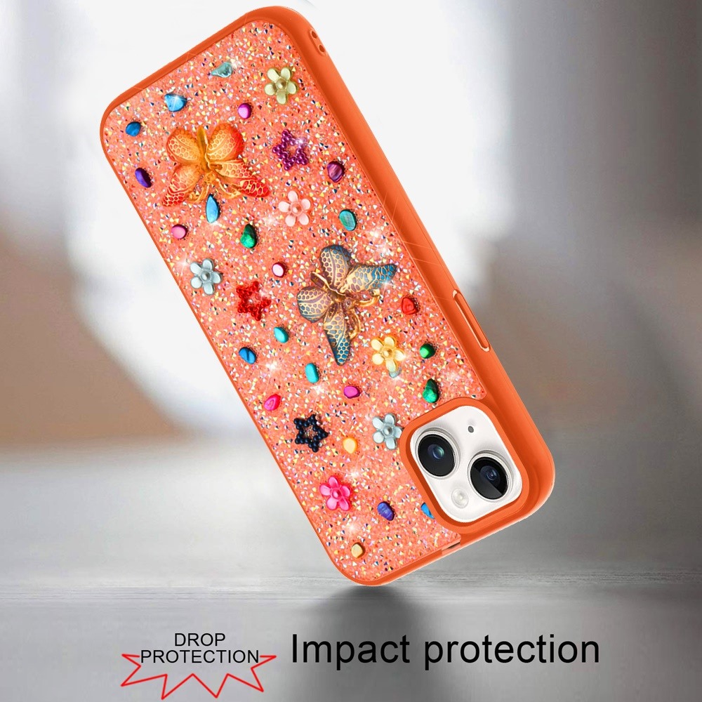 For iPhone 15 Plus/iPhone 14 Plus Butterfly Ornaments Diamond Bling Glitter Hybrid Case - Cosmic Orange