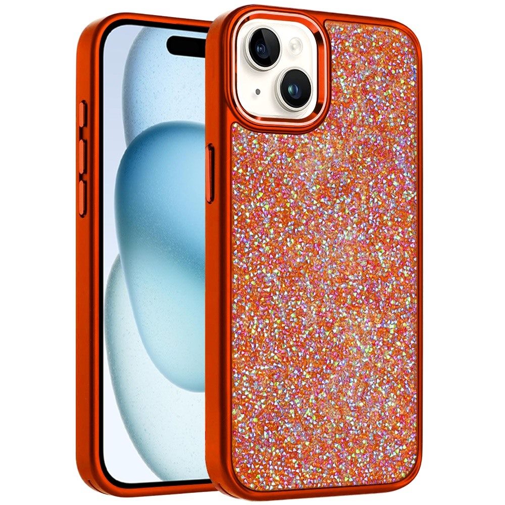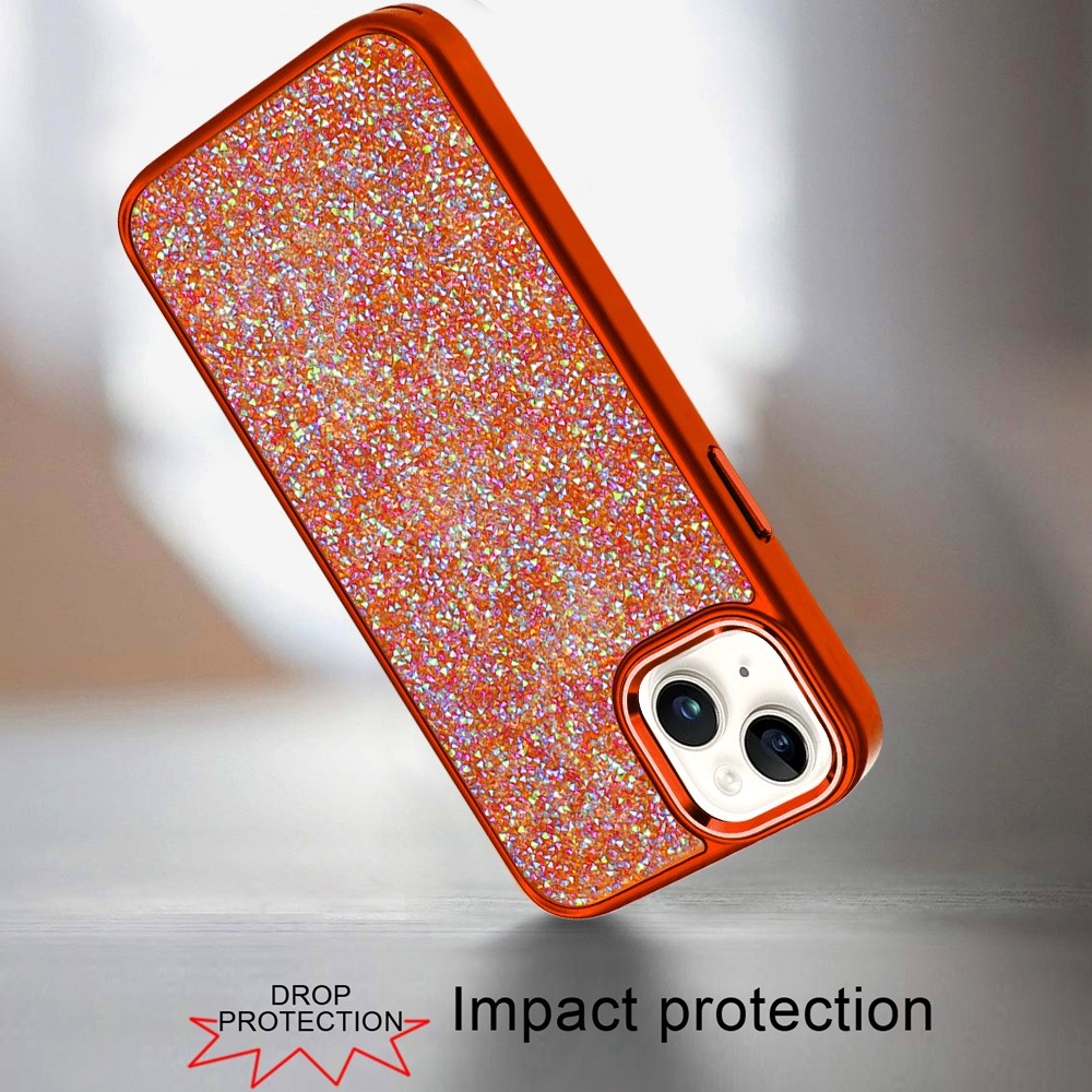For iPhone 15 Plus/iPhone 14 Plus Crystal Glass Diamond with Metallic Buttons and Edges Hybrid Case - Cosmic Orange