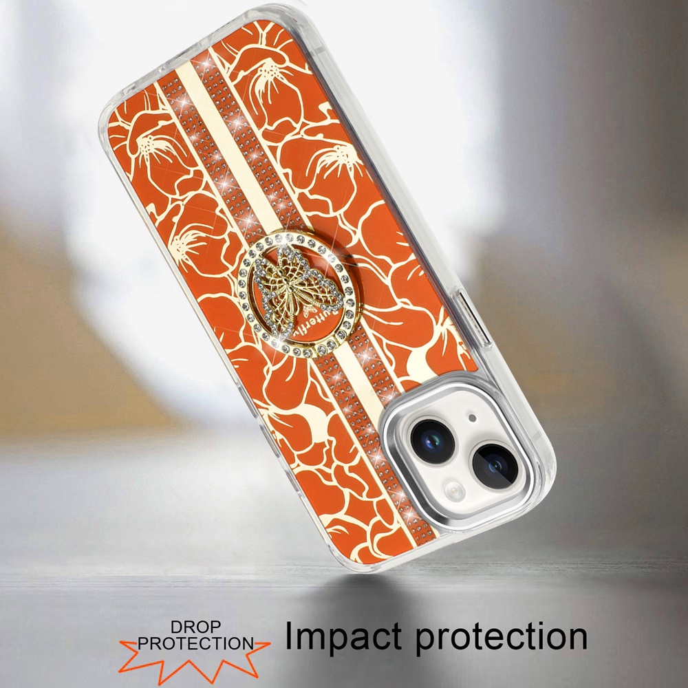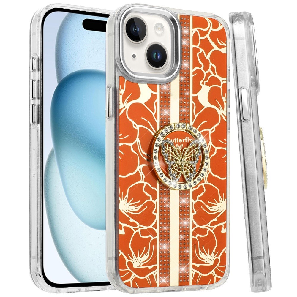 For iPhone 15 Plus/iPhone 14 Plus Splendid Floral Designs with Metal Camera and Buttons with Butterfly Ring Stand Hybrid Case - Cosmic Orange