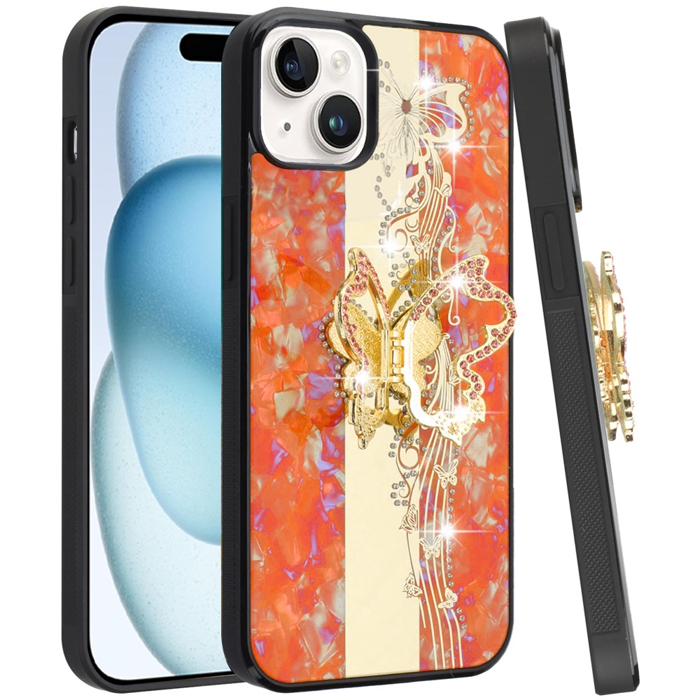 For iPhone 15 Plus/iPhone 14 Plus SPLENDID Diamond Glitter Ornaments Engraving Case Cover - Enchanted Butterfly Cosmic Orange
