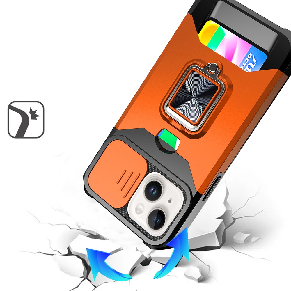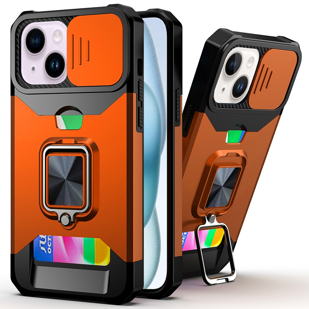 For iPhone 15 Multi-Functional Card Magnetic Ring Stand Hybrid Camera Case Cover - Cosmic Orange