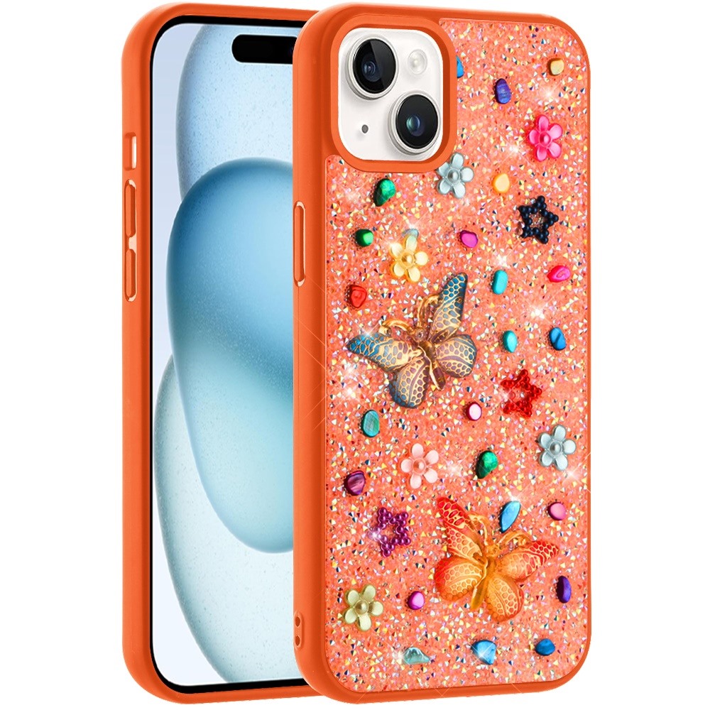 For iPhone 15 Butterfly Ornaments Diamond Bling Glitter Hybrid Case - Cosmic Orange