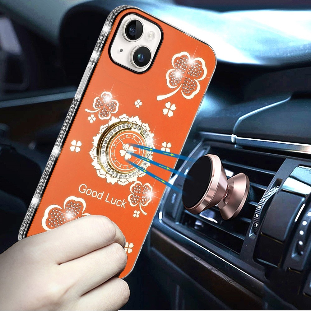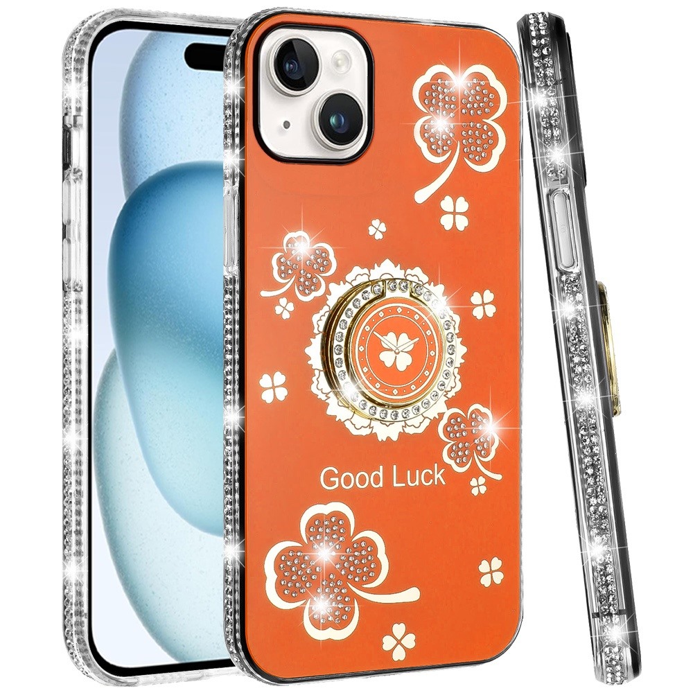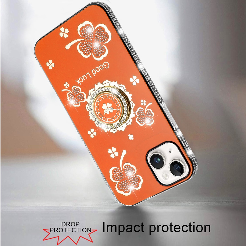 For iPhone 15 Splendid Glitter with Diamonds All Around Edges Ring Stand Case Cover - Cosmic Orange