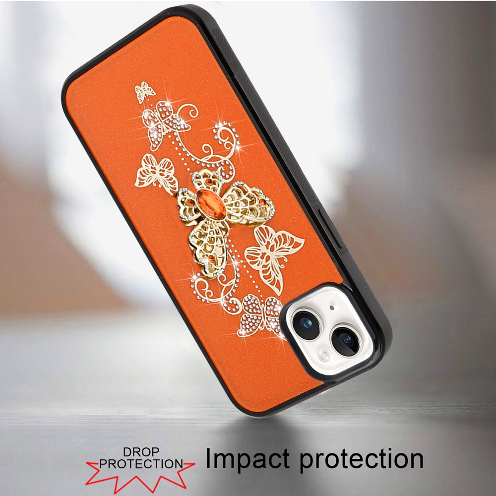 For iPhone 15 SPLENDID Diamond Glitter Ornaments Engraving Case Cover - Garden Butterflies Cosmic Orange