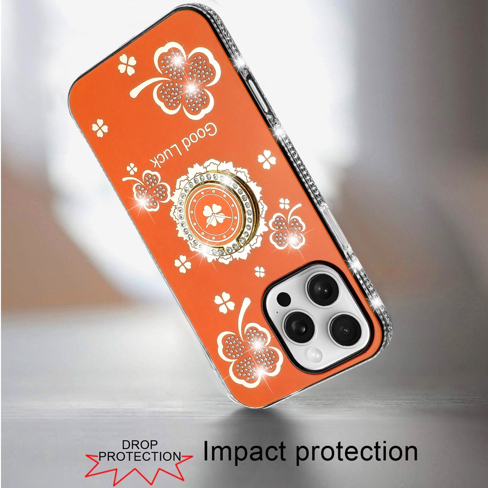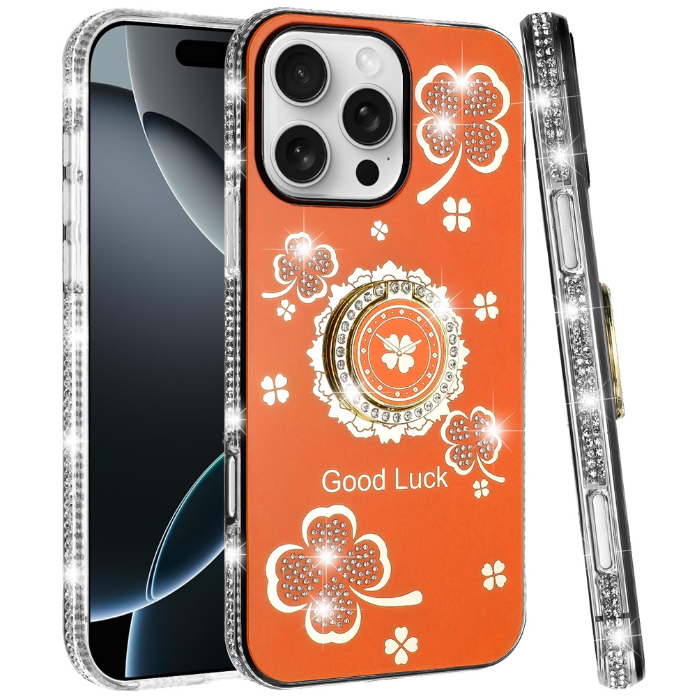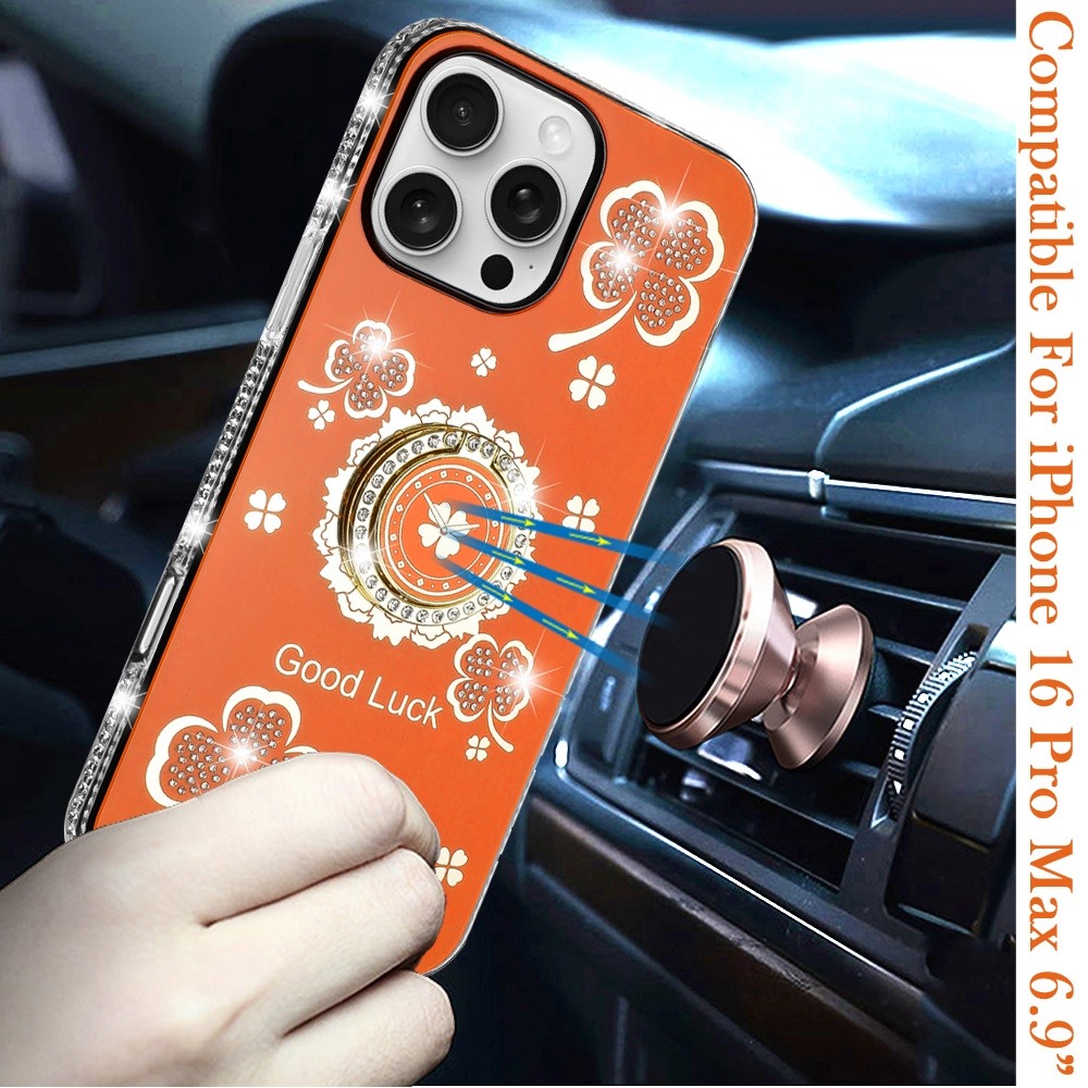 For iPhone 16 Pro Max 6.9 inch Splendid Glitter with Diamonds All Around Edges Ring Stand Case Cover - Cosmic Orange