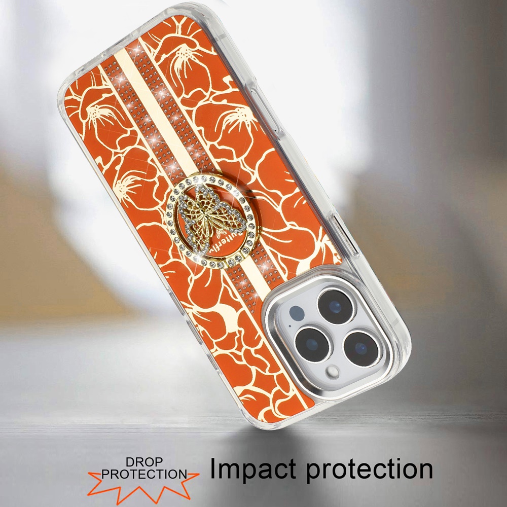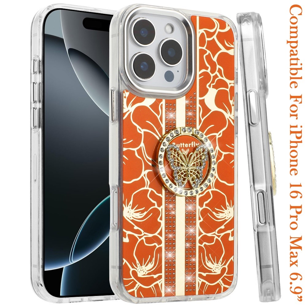 For iPhone 16 Pro Max 6.9 inch Splendid Floral Designs with Metal Camera and Buttons with Butterfly Ring Stand Hybrid Case - Cosmic Orange