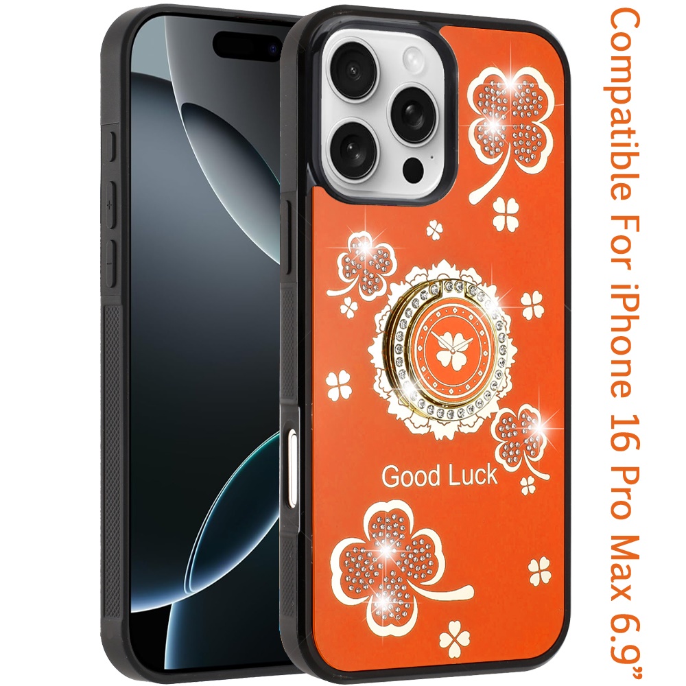 For iPhone 16 Pro Max 6.9 inch SPLENDID Diamond Glitter Ornaments Engraving Case Cover - Good Luck Floral Cosmic Orange