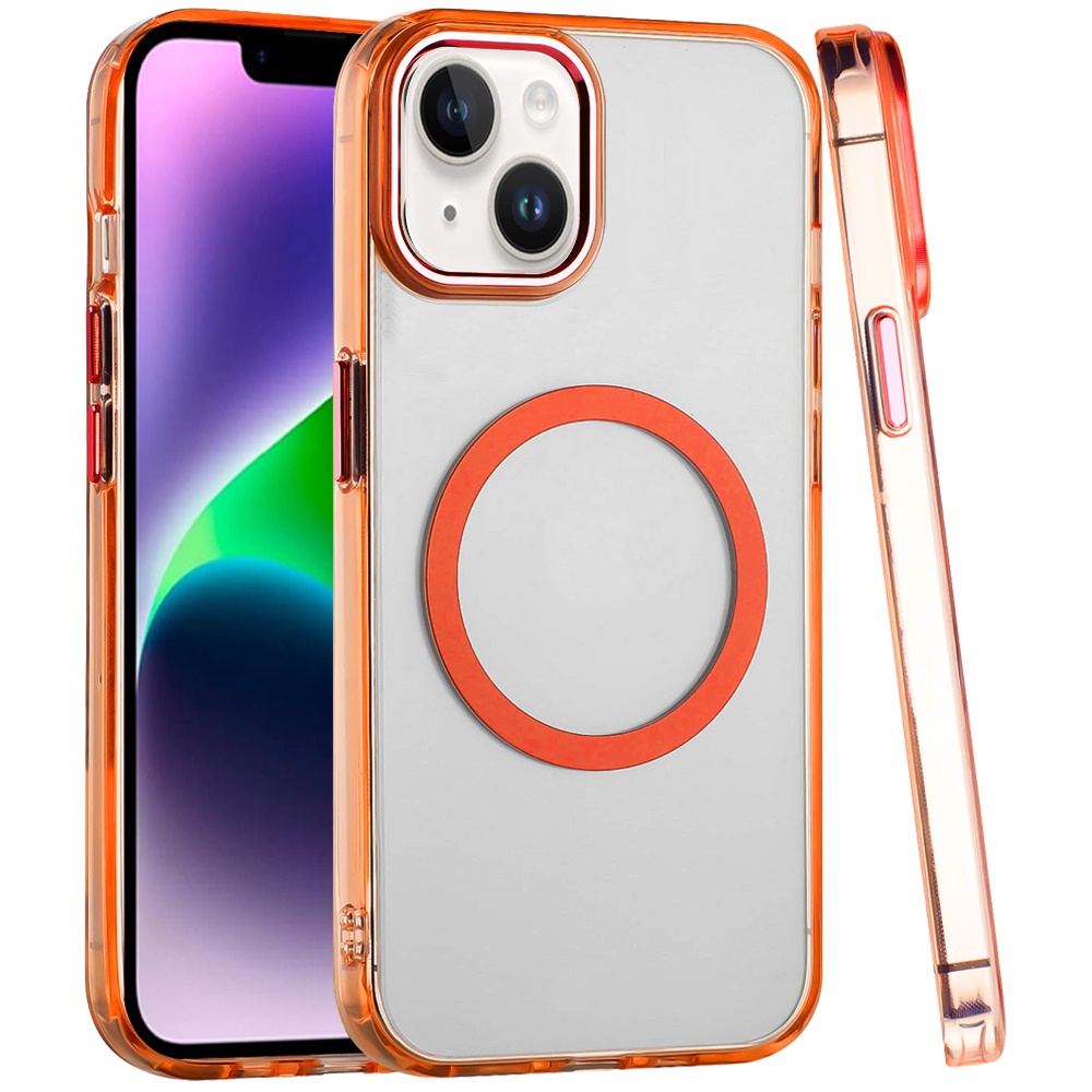 For iPhone 13/14 Magnetic Circle Ring Transparent Premium Acrylic with Metal Buttons & Camera Raised Lip - Cosmic Orange