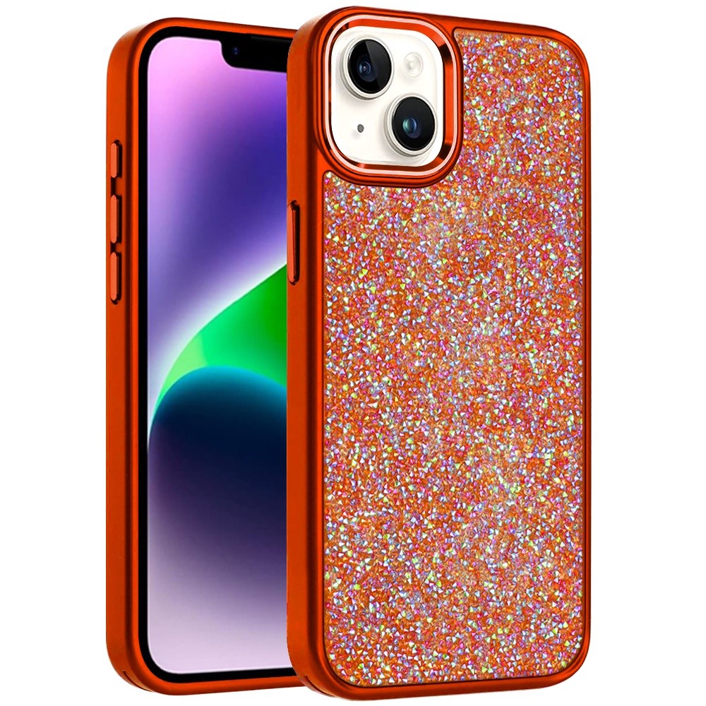 For iPhone 13/14 Crystal Glass Diamond with Metallic Buttons and Edges Hybrid Case - Cosmic Orange