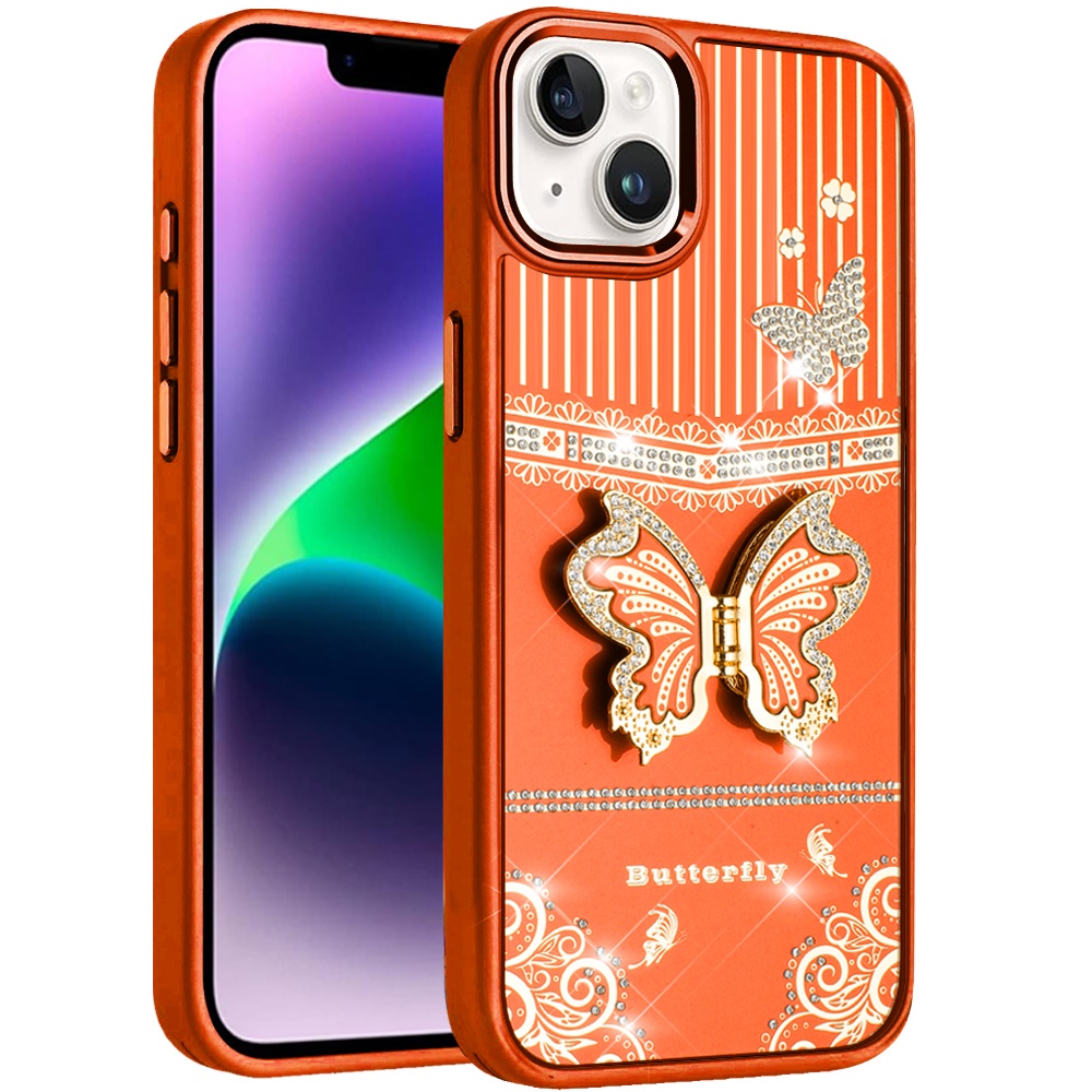 For iPhone 13/14 Splendid Glitter Butterfly Design Stand with Metallic Edges Hybrid Case - Cosmic Orange