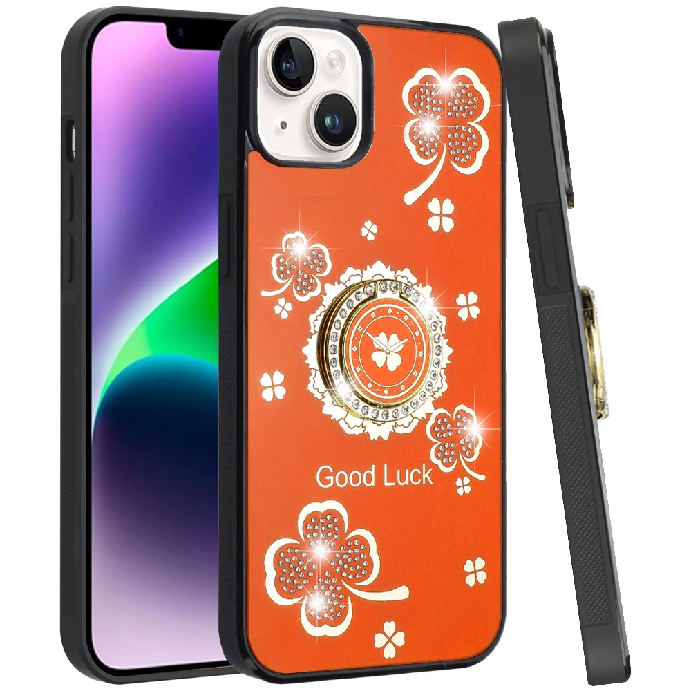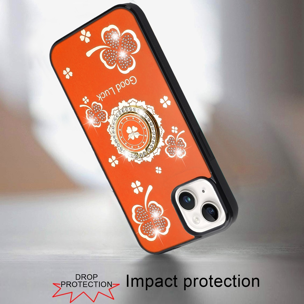 For iPhone 13/14 SPLENDID Diamond Glitter Ornaments Engraving Case Cover - Good Luck Floral Cosmic Orange