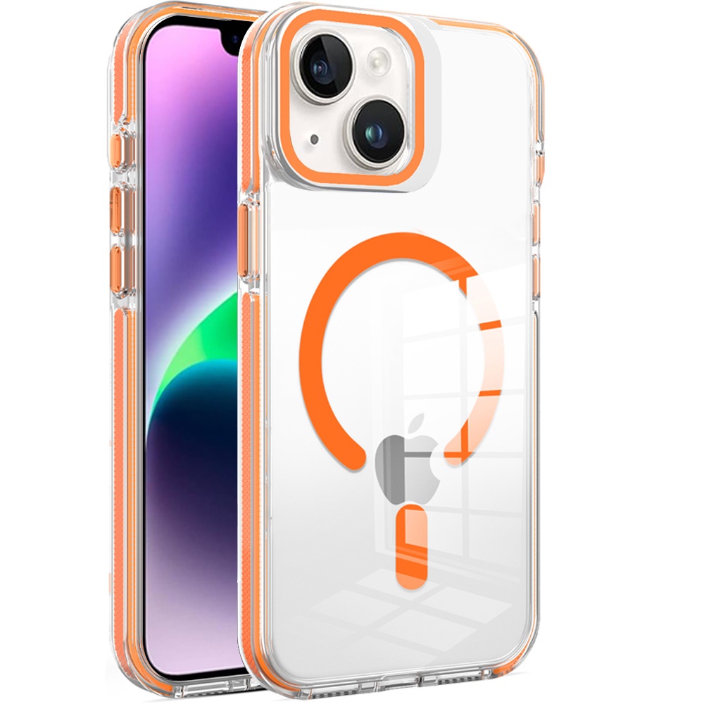For iPhone 13/14 Camera Metallic Stand [Magnetic Circle] Transparent Colorful Matching Edged Tough Hybrid Case - Cosmic Orange