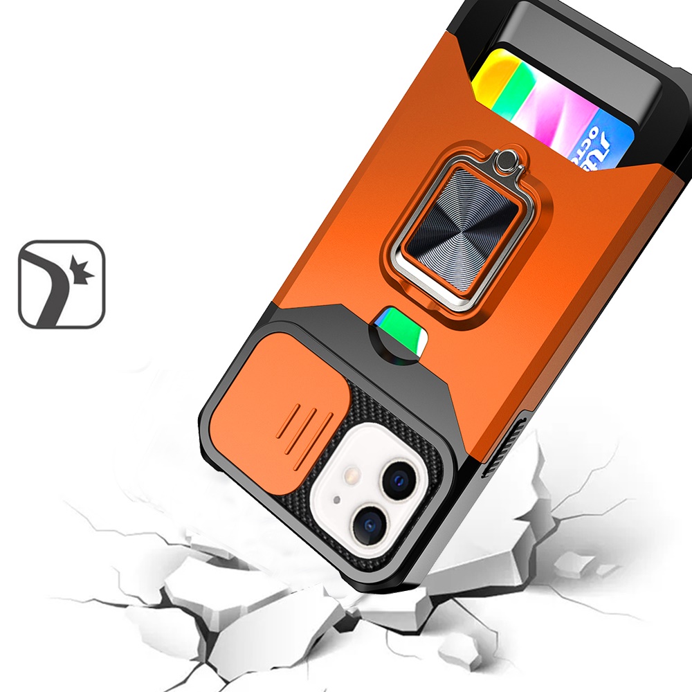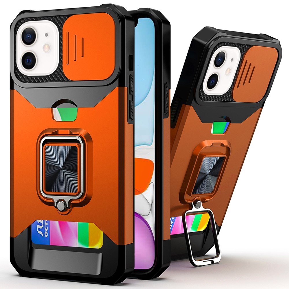 For iPhone 11 (XI6.1) Multi-Functional Card Magnetic Ring Stand Hybrid Camera Case Cover - Cosmic Orange