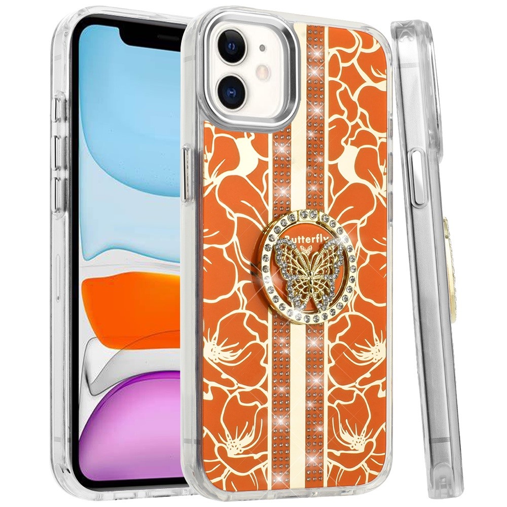 For iPhone 11 (XI6.1) Splendid Floral Designs with Metal Camera and Buttons with Butterfly Ring Stand Hybrid Case - Cosmic Orange