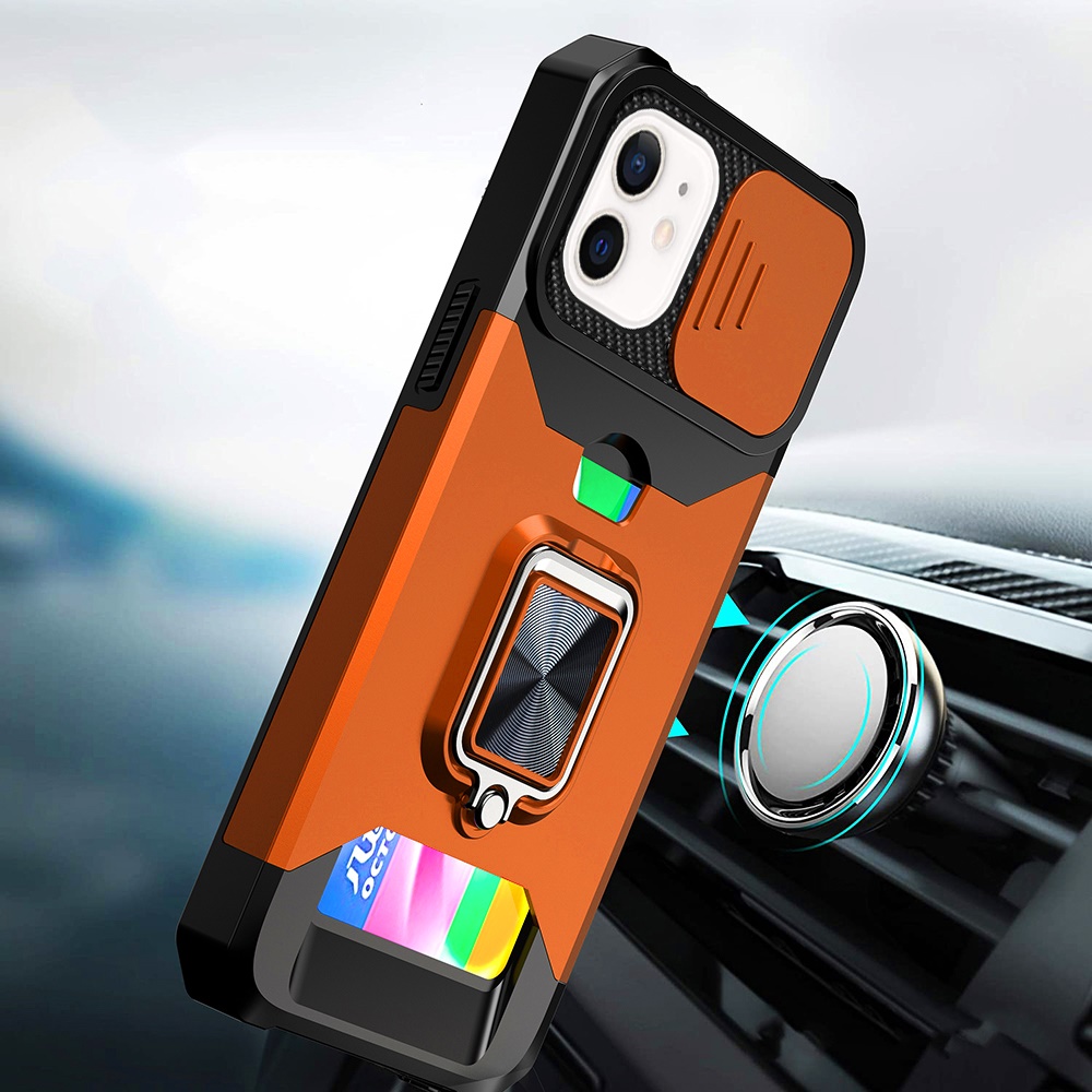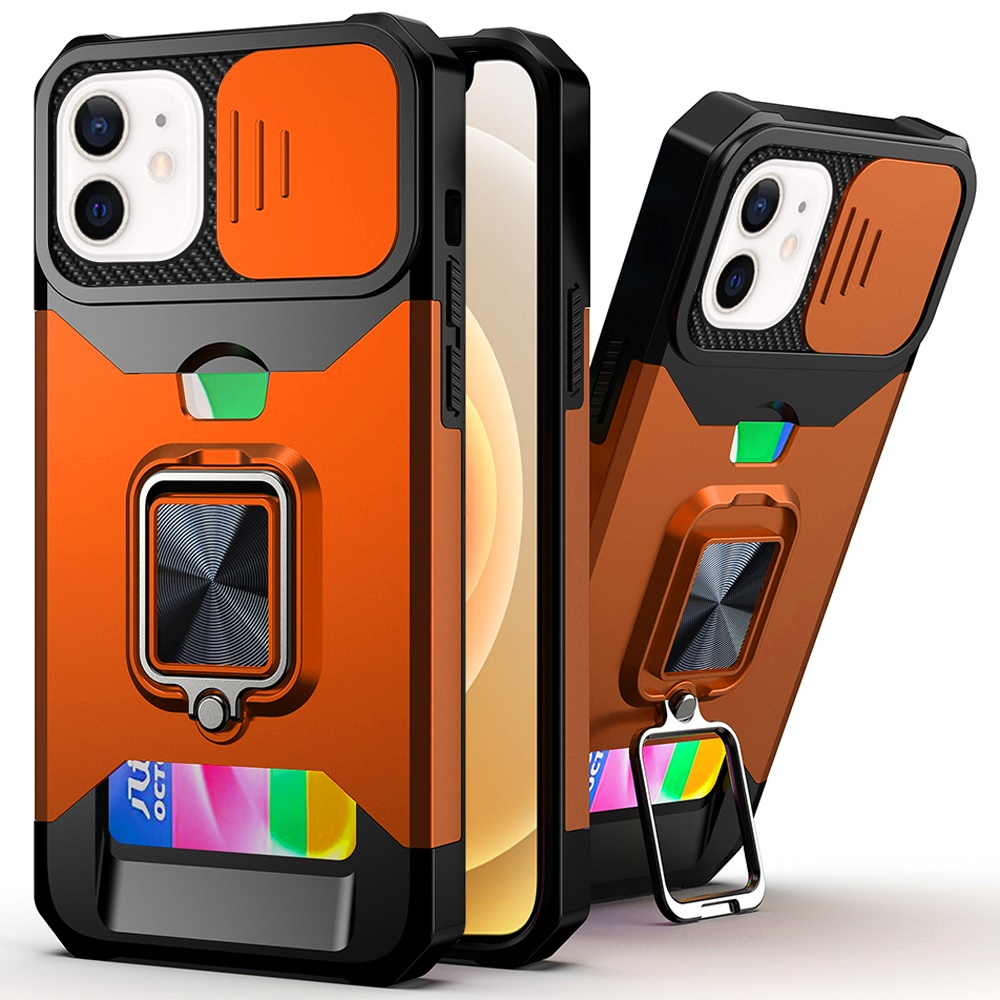 For iPhone 12 & iPhone 12 Pro Multi-Functional Card Magnetic Ring Stand Hybrid Camera Case Cover - Cosmic Orange