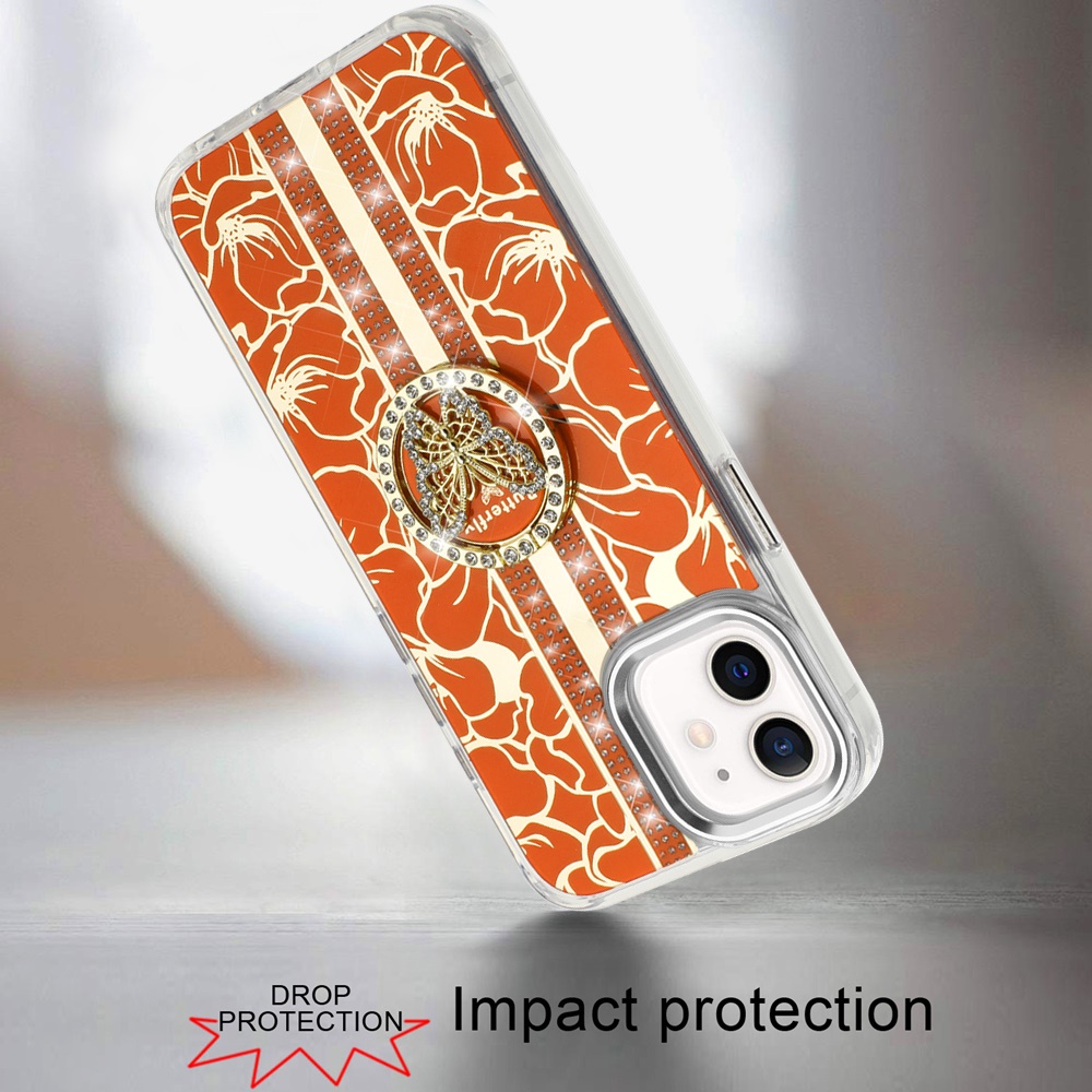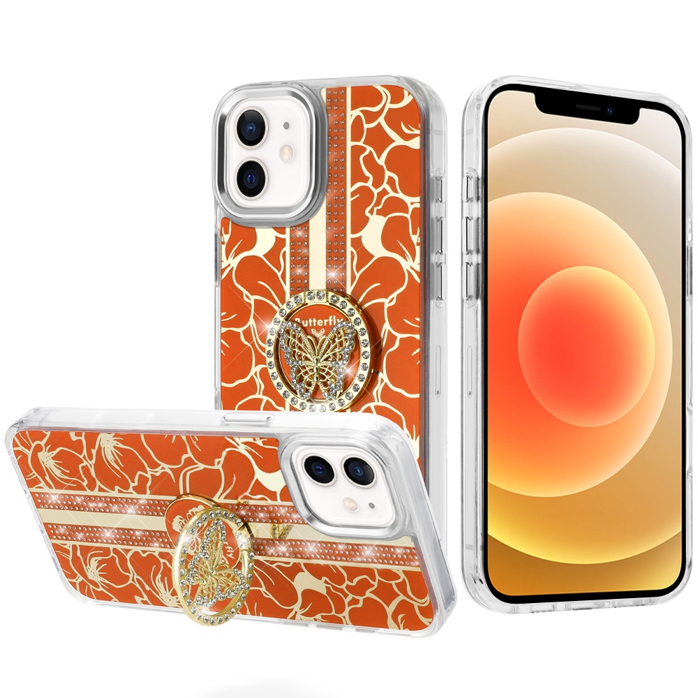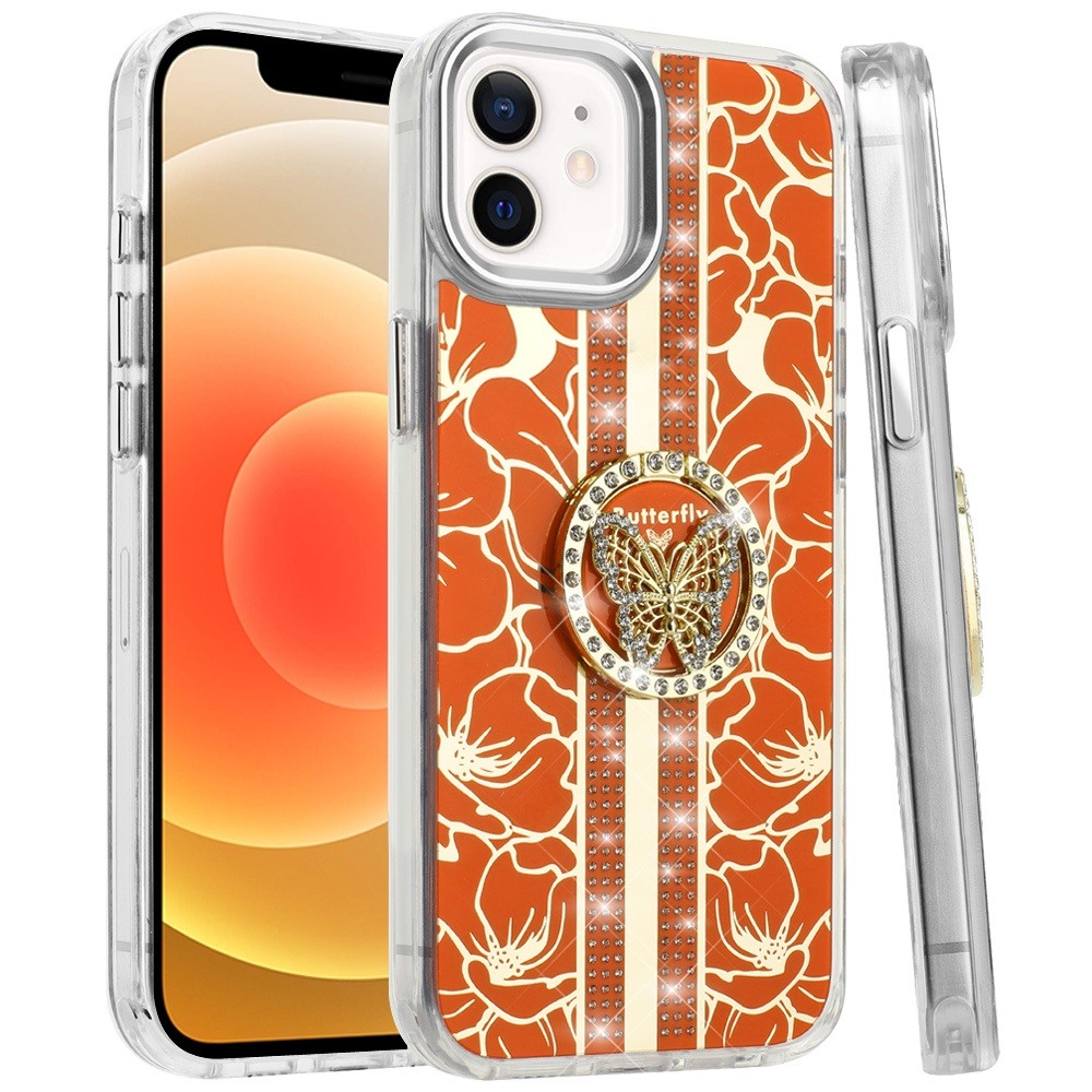 For iPhone 12 & iPhone 12 Pro Splendid Floral Designs with Metal Camera and Buttons with Butterfly Ring Stand Hybrid Case - Cosmic Orange