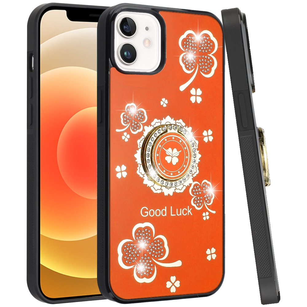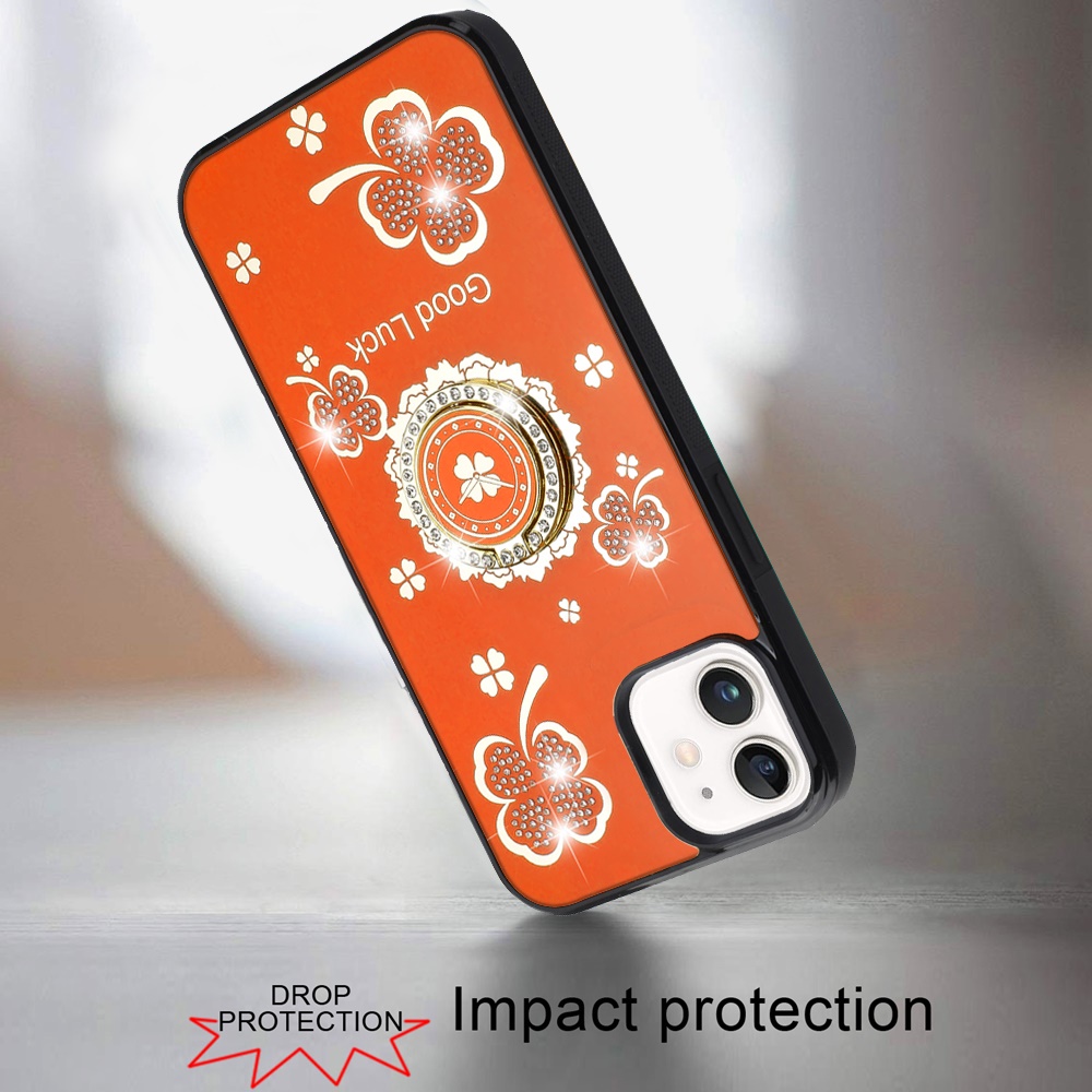 For iPhone 12 & iPhone 12 Pro SPLENDID Diamond Glitter Ornaments Engraving Case Cover - Good Luck Floral Cosmic Orange