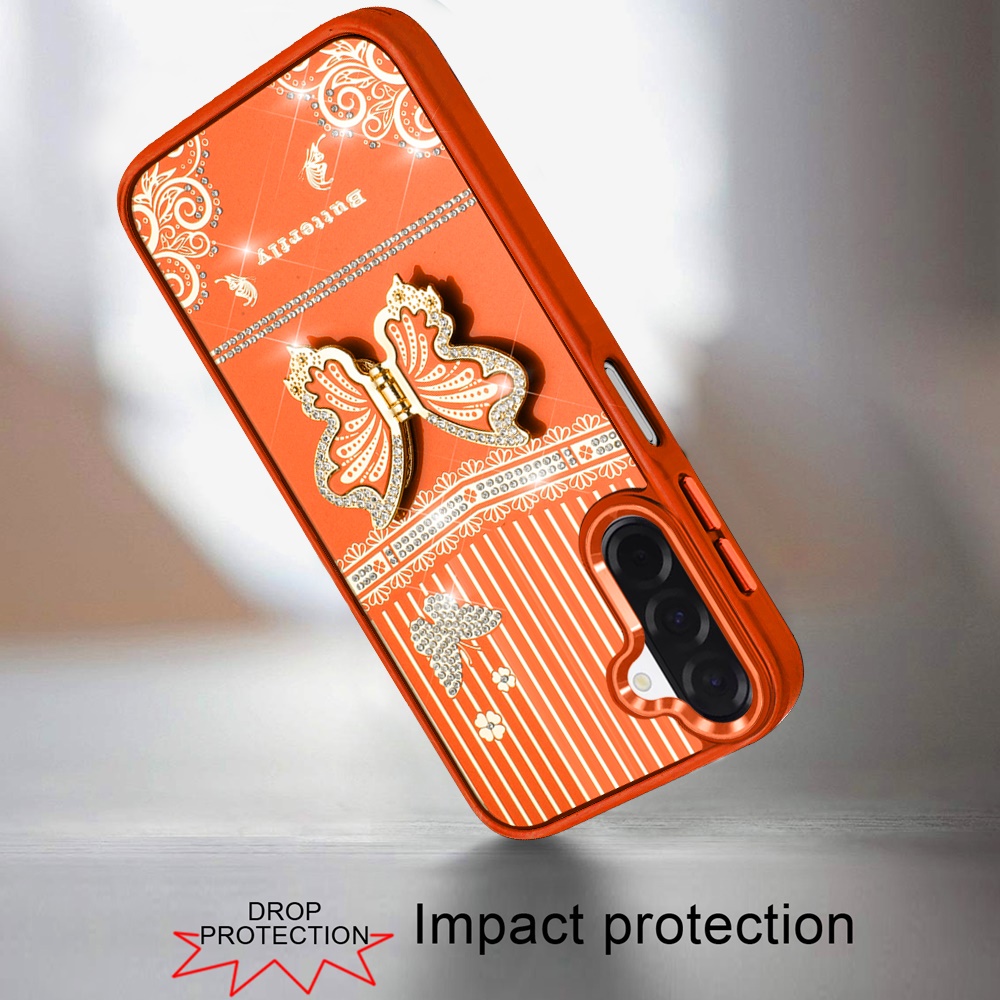 For Samsung A17 5G Splendid Glitter Butterfly Design Stand with Metallic Edges Hybrid Case - Cosmic Orange