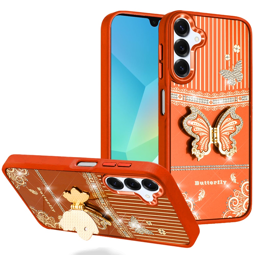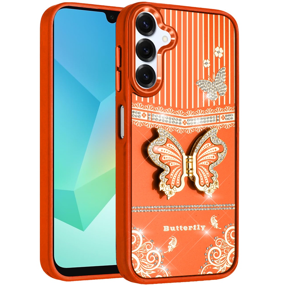 For Samsung A16 5G Splendid Glitter Butterfly Design Stand with Metallic Edges Hybrid Case - Cosmic Orange